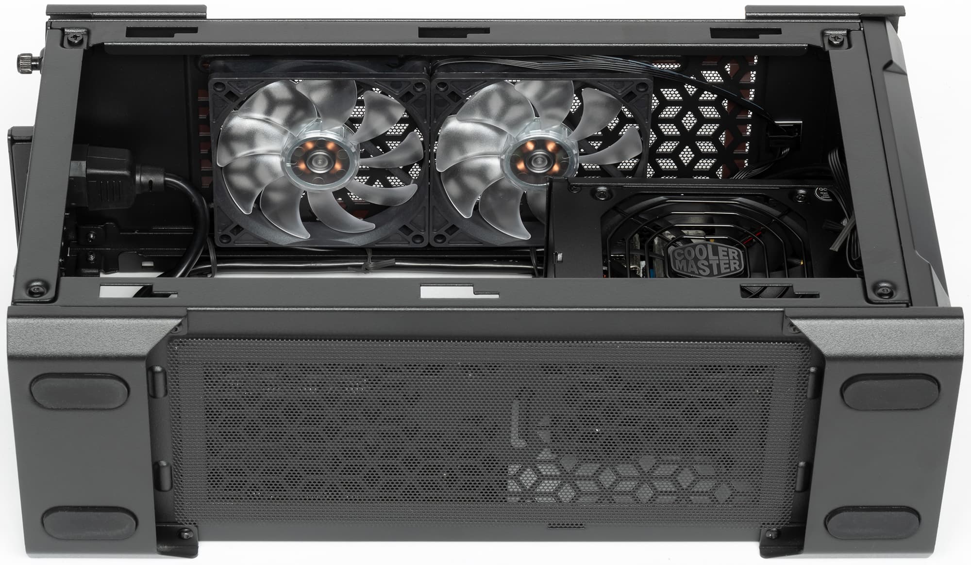 На долю установленных под верхней панелью вентиляторов диаметром 92 мм остается только продув внутреннего пространства, с чем они отлично справляются на минимальных оборотах, на максимум в 2600 об/мин не выходя практически никогда.