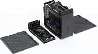 Разбирается корпус легко и без инструментов: откручиваем шесть винтов, снимаем верхнюю и боковые панели. Еще в процессе взгляд упирается в блок питания формата SFX. Это хорошо — поскольку в случае чего заменить будет проще, чем Flex ATX у шасси Intel. Да и вентилятор установлен большой и тихий.