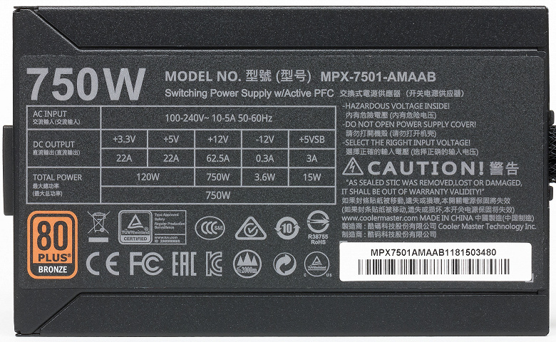 Все необходимые параметры указаны на корпусе блока питания в полном объеме, для мощности шины +12VDC заявлено значение 750 Вт. Соотношение мощности по шине +12VDC и полной мощности составляет 1,0, что является отличным показателем.
