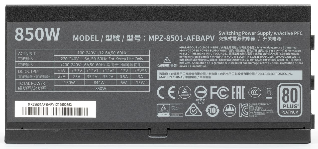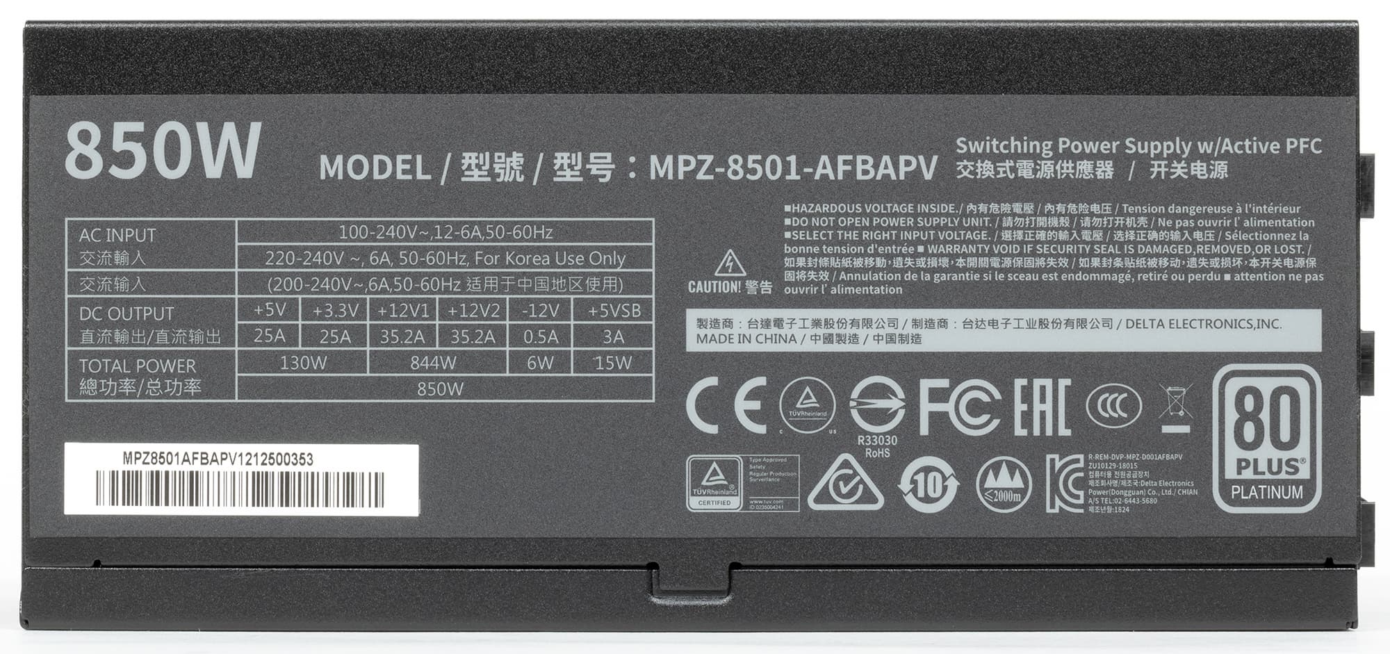 У нас в лаборатории оказался источник питания Cooler Master V850 Platinum, имеющий максимальную выходную мощность 850 Вт. Помимо него в данной серии представлены модели мощностью 1000, 1200 и 1300 Вт, все они характеризуются использованием японских конденсаторов, а также наличием сертификата 80Plus Platinum.