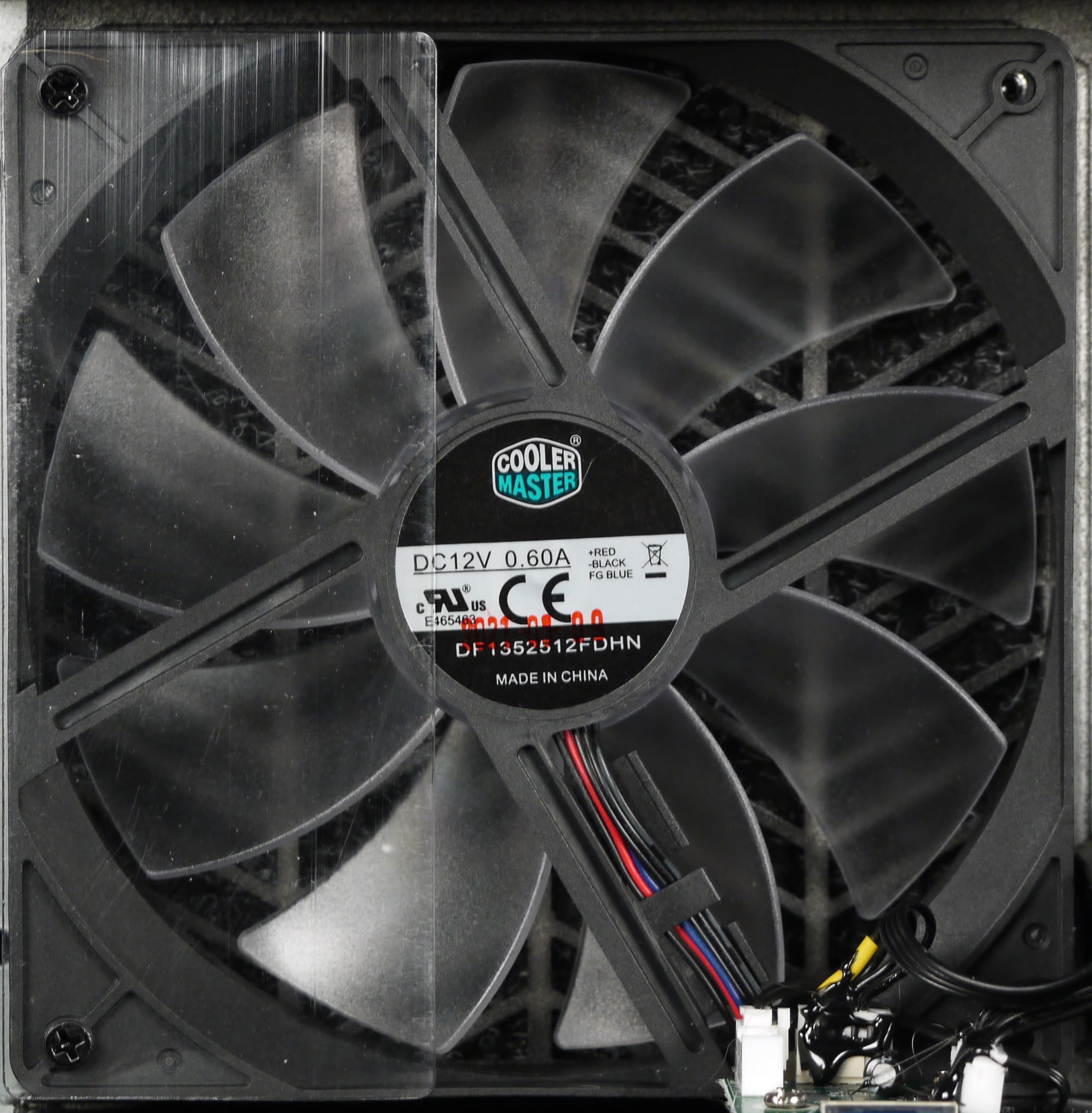 В блоке питания установлен вентилятор, брендированный как Cooler Master DF1352512FDHN и основанный на гидродинамическом подшипнике. С точки зрения срока службы такой подшипник выглядит предпочтительнее, чем типичный подшипник скольжения, используемый в компьютерных вентиляторах. Подключение вентилятора — трехпроводное, через разъем.