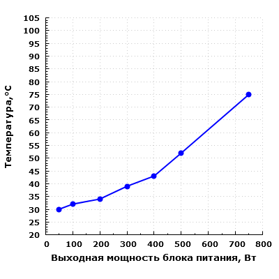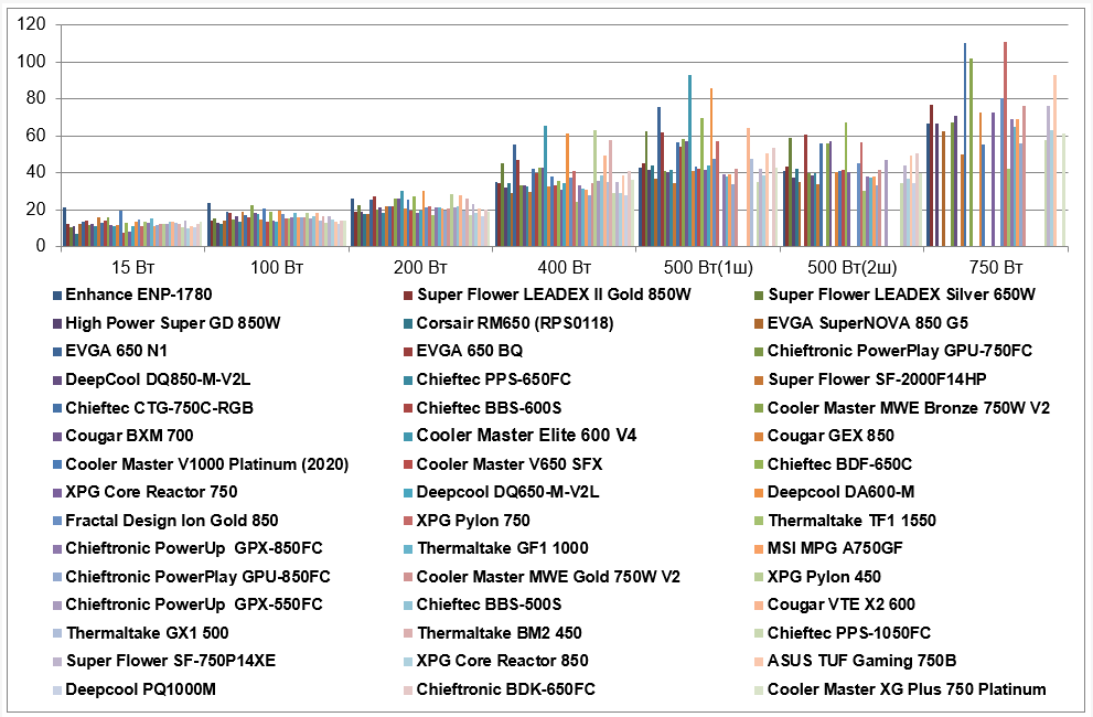 Впрочем, на низкой и средней мощности экономичность вполне достойная, тестируемый блок питания находится примерно в середине списка.