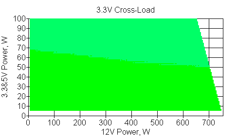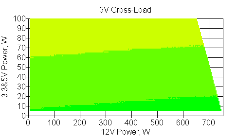 Следующим этапом инструментального тестирования является построение кросснагрузочной характеристики (КНХ) и представление ее на четвертьплоскости, ограниченной максимальной мощностью по шине 3,3&5 В с одной стороны (по оси ординат) и максимальной мощностью по шине 12 В с другой (по оси абсцисс). В каждой точке измеренное значение напряжения обозначается цветовым маркером в зависимости от отклонения от номинального значения.