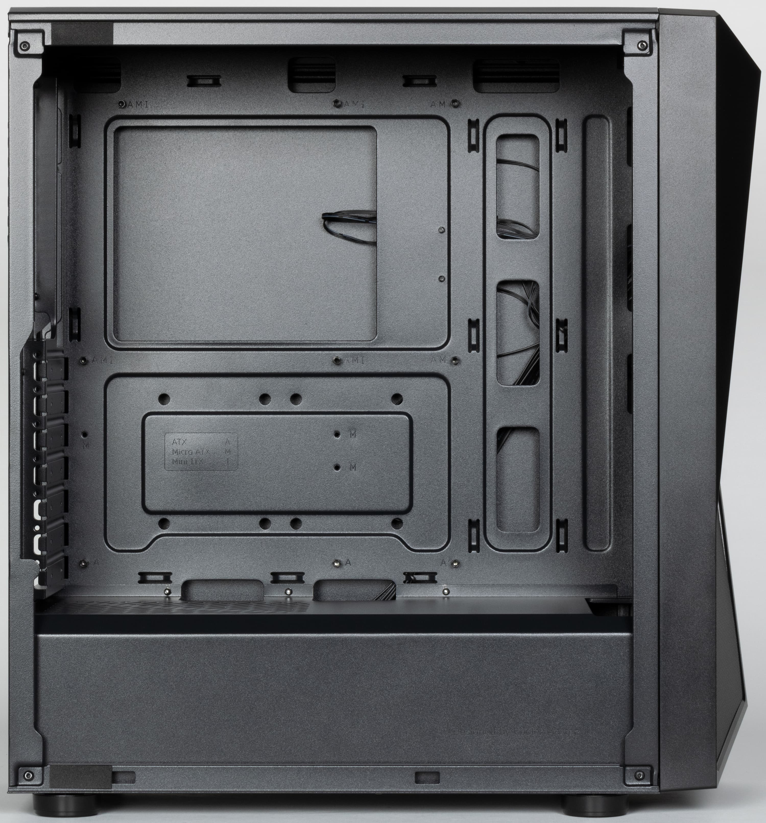 Глубина отсека для прокладки проводов составляет около 17 мм у задней стенки. Это не так уж много, поэтому блок питания лучше предпочесть с ленточными проводами. Для монтажа проводов предусмотрены петли для крепления стяжек или других аналогичных изделий. В монтажных отверстиях на основании для системной платы лепестковые мембраны отсутствуют.