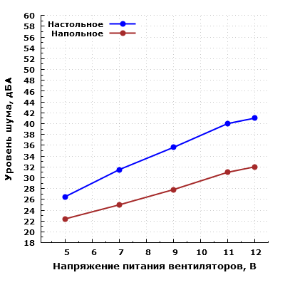 При большем удалении корпуса от пользователя и размещении его, к примеру, на полу под столом, шум можно будет охарактеризовать как низкий при питании вентиляторов от 5 В, а при питании от 12 В — как средний для жилого помещения в дневное время суток.