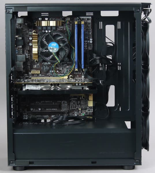 Посадочные места для накопителей с внешним доступом в корпусе полностью отсутствуют. Так что компоновка вполне типовая для современных решений, никаких заметных особенностей нет.