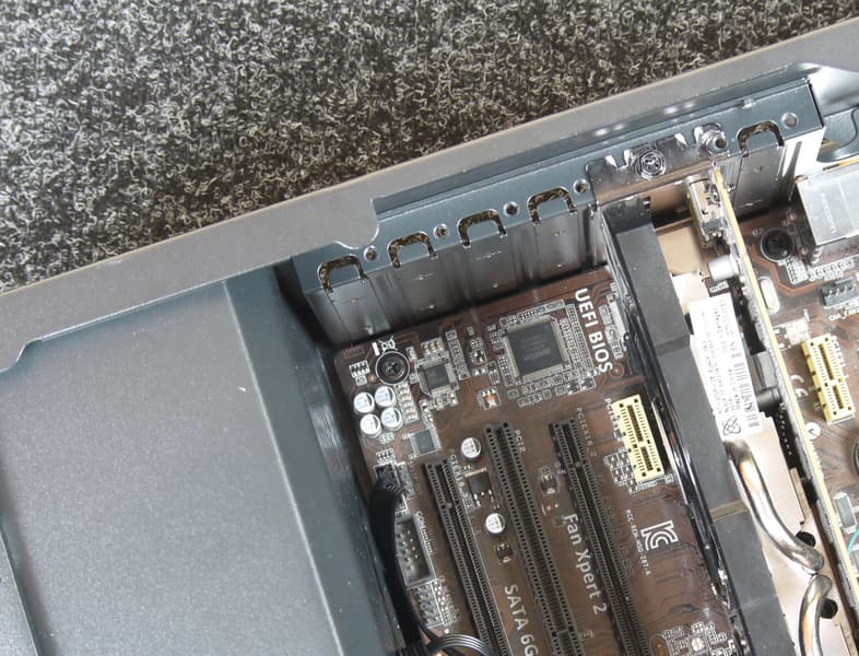 Система фиксации карт расширения самая обычная — крепление на винтах изнутри корпуса. Все заглушки на задней панели одноразовые, их требуется выломать перед установкой плат расширения. И действовать нужно аккуратно, поскольку выломать заглушки не так-то просто, а вот погнуть заднюю панель около заглушек можно довольно легко. Для опытного сборщика это не будет большой проблемой, просто займет чуть больше времени, а вот начинающий вполне может переусердствовать вплоть до разрушения элементов корпуса.