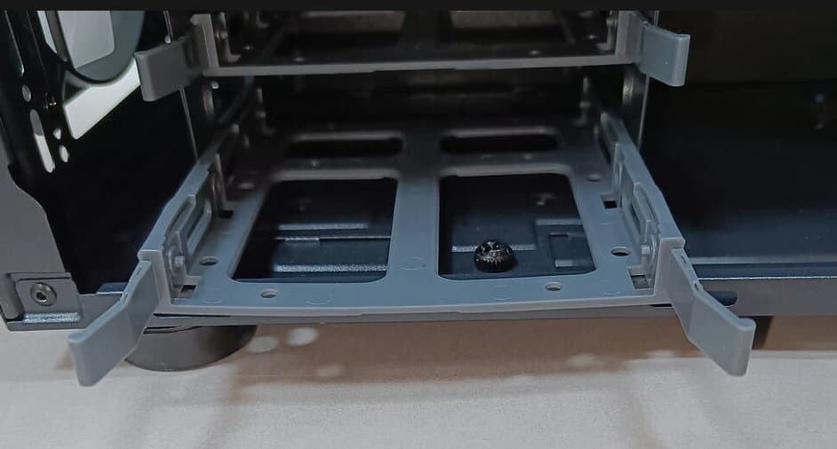 Всего в корпус можно установить 4 накопителя формата 2,5 дюйма или 2×3,5″ и 2×2,5″. Этого более чем достаточно для типичного домашнего или офисно-рабочего компьютера. Корзину обдувает передний вентилятор.