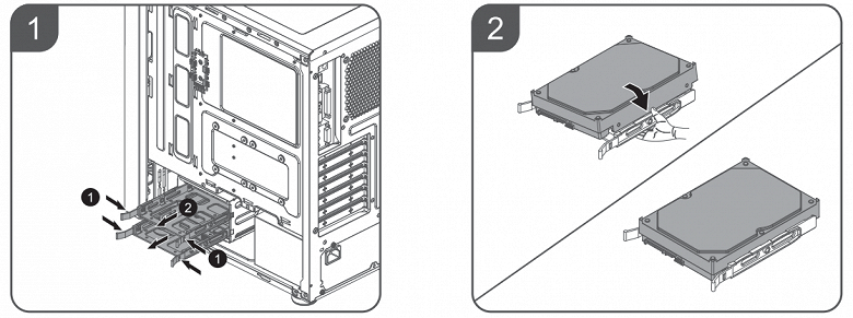 Диски устанавливаются в корзину через пластиковые рамки, фиксируются при помощи винтов через дно и сбоку. В корзину можно установить как полноразмерный диск, так и накопитель формата 2,5 дюйма.