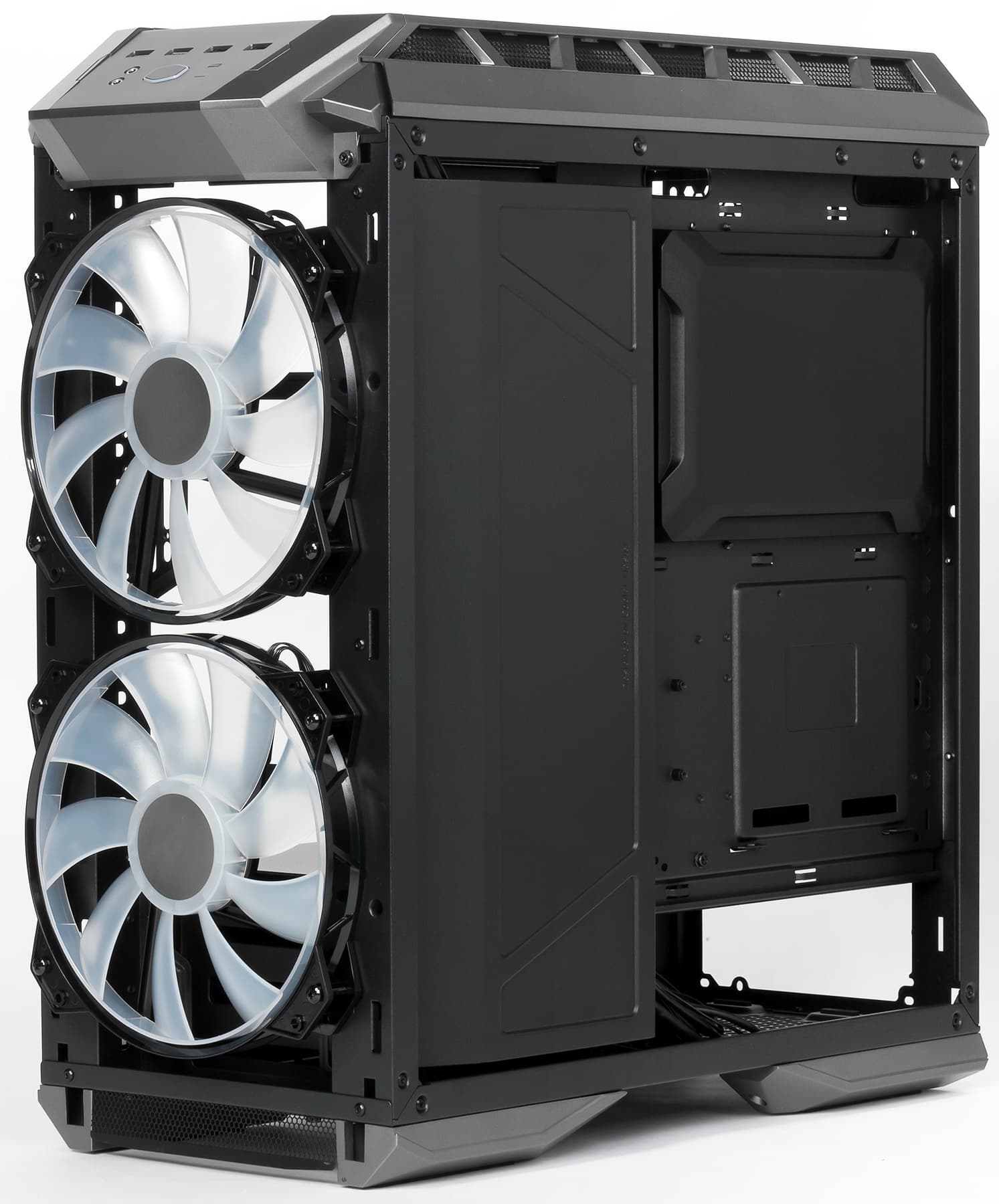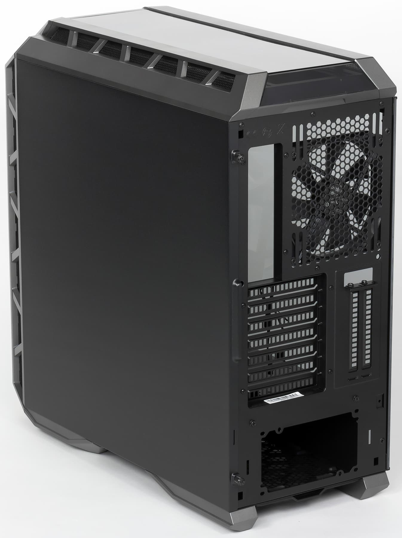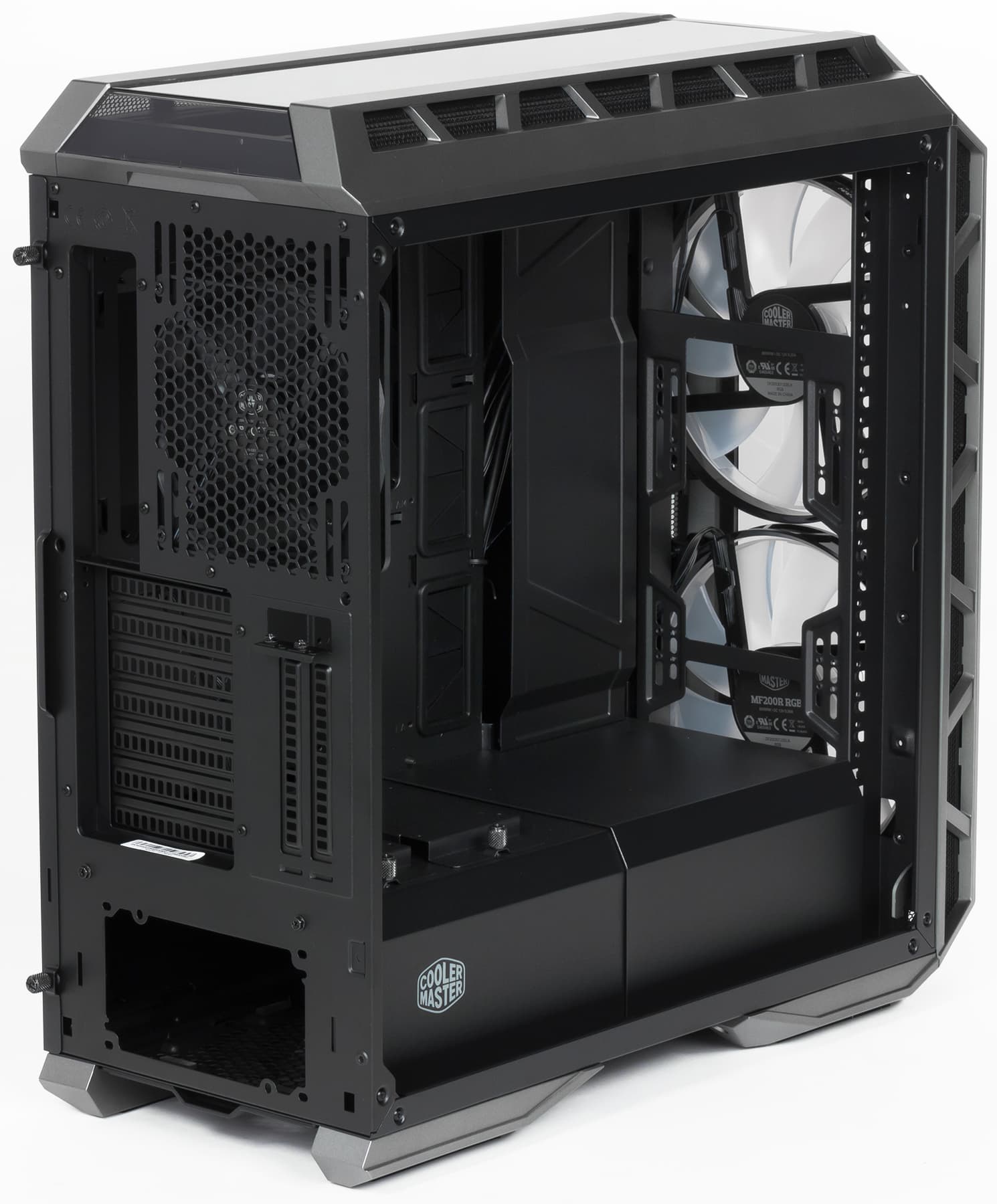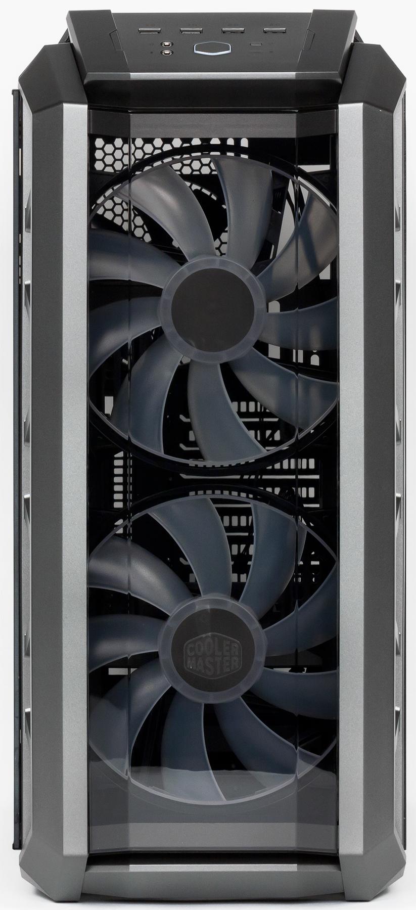 Корпус MasterCase H500P укомплектован тремя вентиляторами. Задний вполне обычный — и по конструктиву, и по способу установки (вытяжной); его параметры: 140×25 мм, 1200 об/мин, без подсветки, оснащен стандартным 3-контактным коннектором.