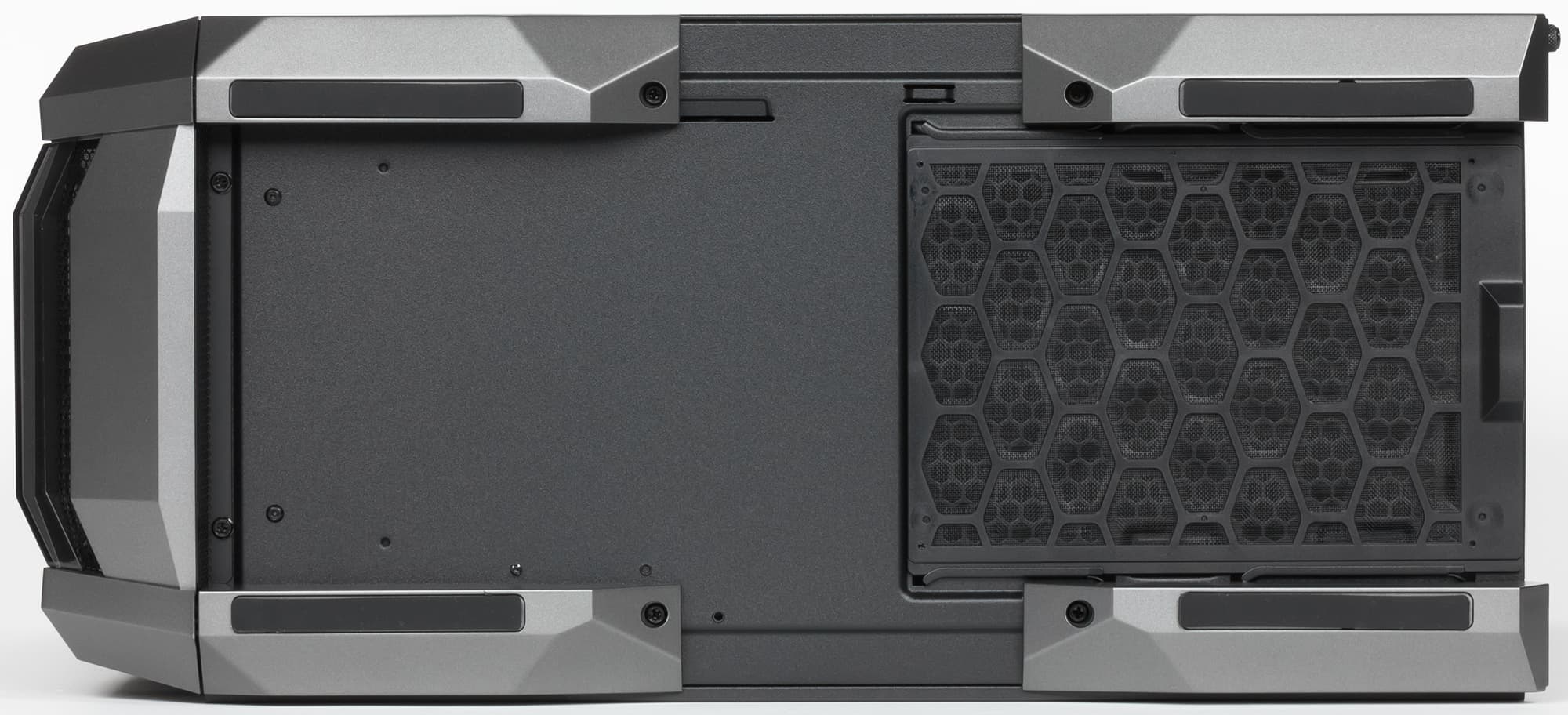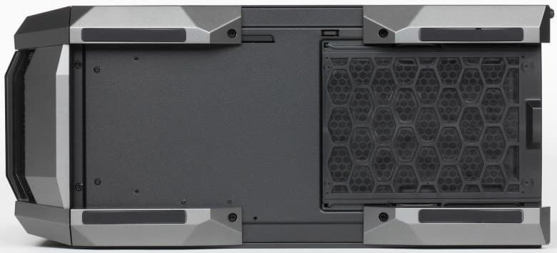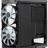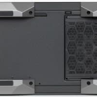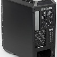 На днище шасси есть лишь отверстия в месте расположения блока питания, причем размер перфорированной области вполне достаточный и для самых больших 230-миллиметровых БП. Боковые стенки (и левая стеклянная, и правая металлическая) сплошные, размещение вентиляторов на них также невозможно.