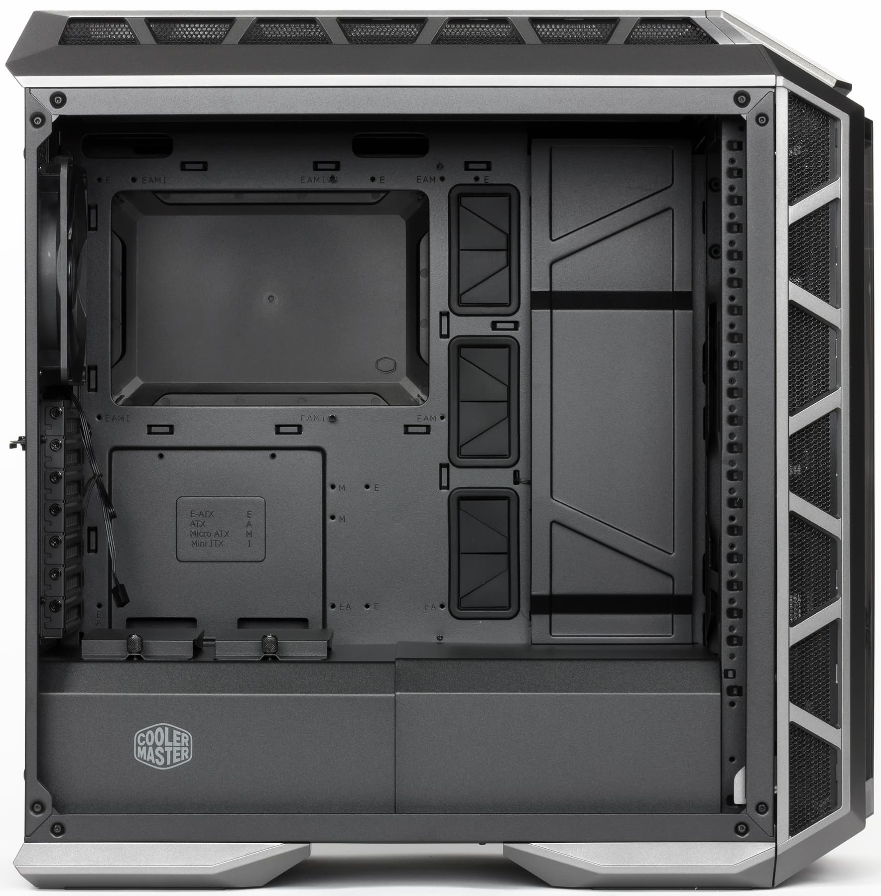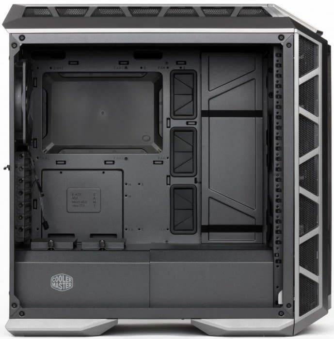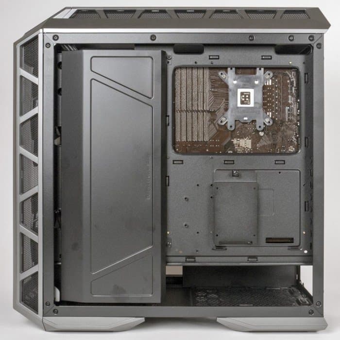 А в данном случае оно снабжено пластиковой крышкой, и надпись на посвященной корпусу H500P странице официального сайта гордо гласит (в нашем вольном переводе): «В Cooler Master первыми придумали сделать отверстие в районе процессора, и первыми же закрыли его снова». В отличие от самого отверстия, эта крышка имеет чисто декоративные функции, причем довольно сомнительные: правая боковая стенка непрозрачная, сама матплата тоже, и крышку никто, кроме сборщика, попросту не увидит.