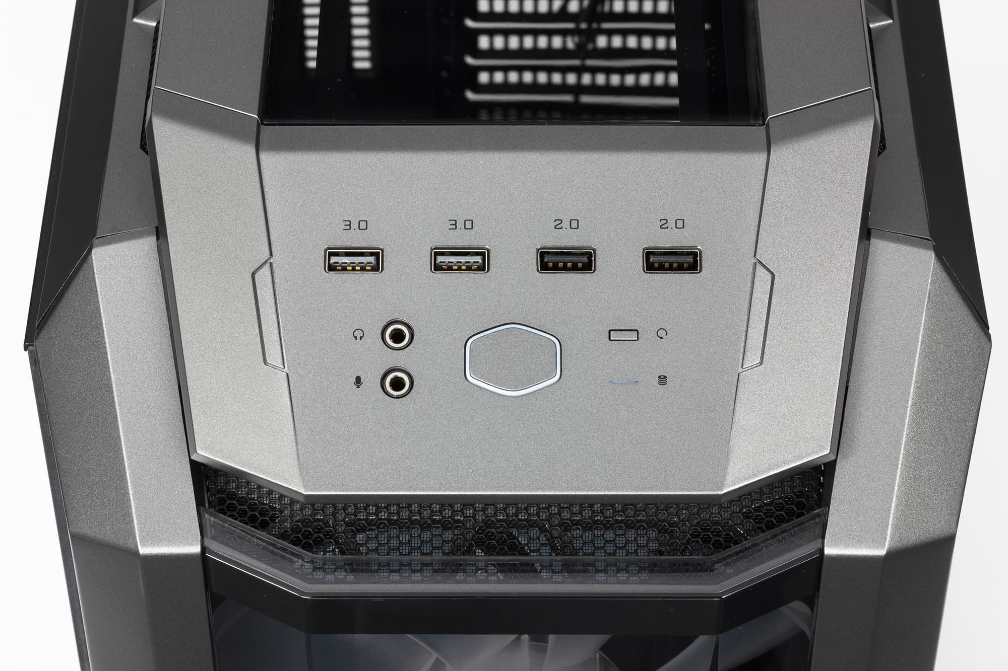 В центре нижнего ряда крупная кнопка Power, выполненная в виде шестиугольника с обрамляющей подсветкой белого цвета. Слева от нее пара аудиоразъемов, справа — крошечная кнопка Reset и индикатор дисковой активности, также белого цвета.