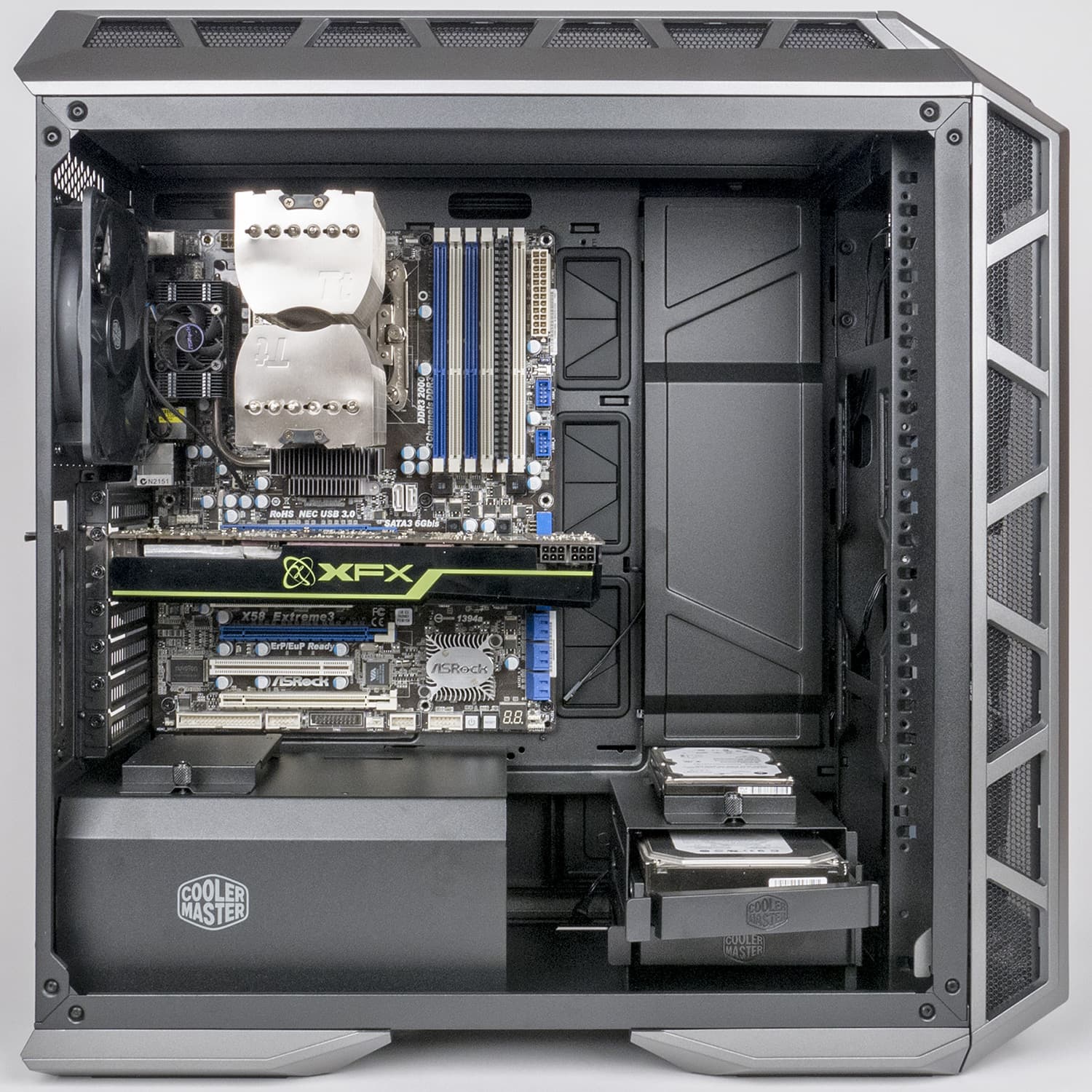 Внутренний объем корпуса Г-образной перегородкой делится на две части — меньшую нижнюю, предназначенную для блока питания и двухместной стойки для накопителей, и бо́льшую верхнюю для всего остального. Такое деление не редкость, интересна его реализация в данном случае: перегородка состоит из двух частей, причем обе съемные. Можно, например, удалить ближнюю к передней панели часть, оставив закрытым БП вместе с выходящими из него пучками проводов, которым сложно придать эстетичный вид, что весьма актуально с учетом практически полностью прозрачной боковой стенки (у нее окрашена в черный цвет лишь двухсантиметровая полоса по периметру).