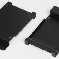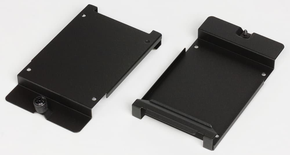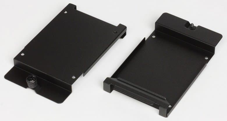 Отдельные лотки для дисков размерностью 2,5″ имеют коробчатую форму, накопитель можно устанавливать двумя способами: сверху, закрепляя винтами, и внутрь «коробочки» — тогда винты можно будет и не использовать (именно так рекомендует делать рисунок в инструкции: конструкция лотка не даст диску не только выпасть, но даже сдвинуться на сколь-нибудь заметное расстояние). Первый из перечисленных вариантов не подходит для случая размещения дисков за основанием системной платы, иначе невозможно будет закрыть правую крышку.