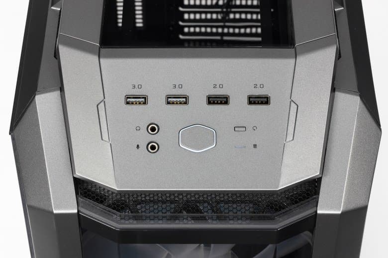 Содержимое панели управления расположено в два ряда, в верхнем находятся порты — по два USB 2.0 и USB 3.0. Разъемы ориентированы в одну линию, а зазор между ними составляет 11 мм, поэтому возможны проблемы при одновременном подключении широких устройств в соседние порты.