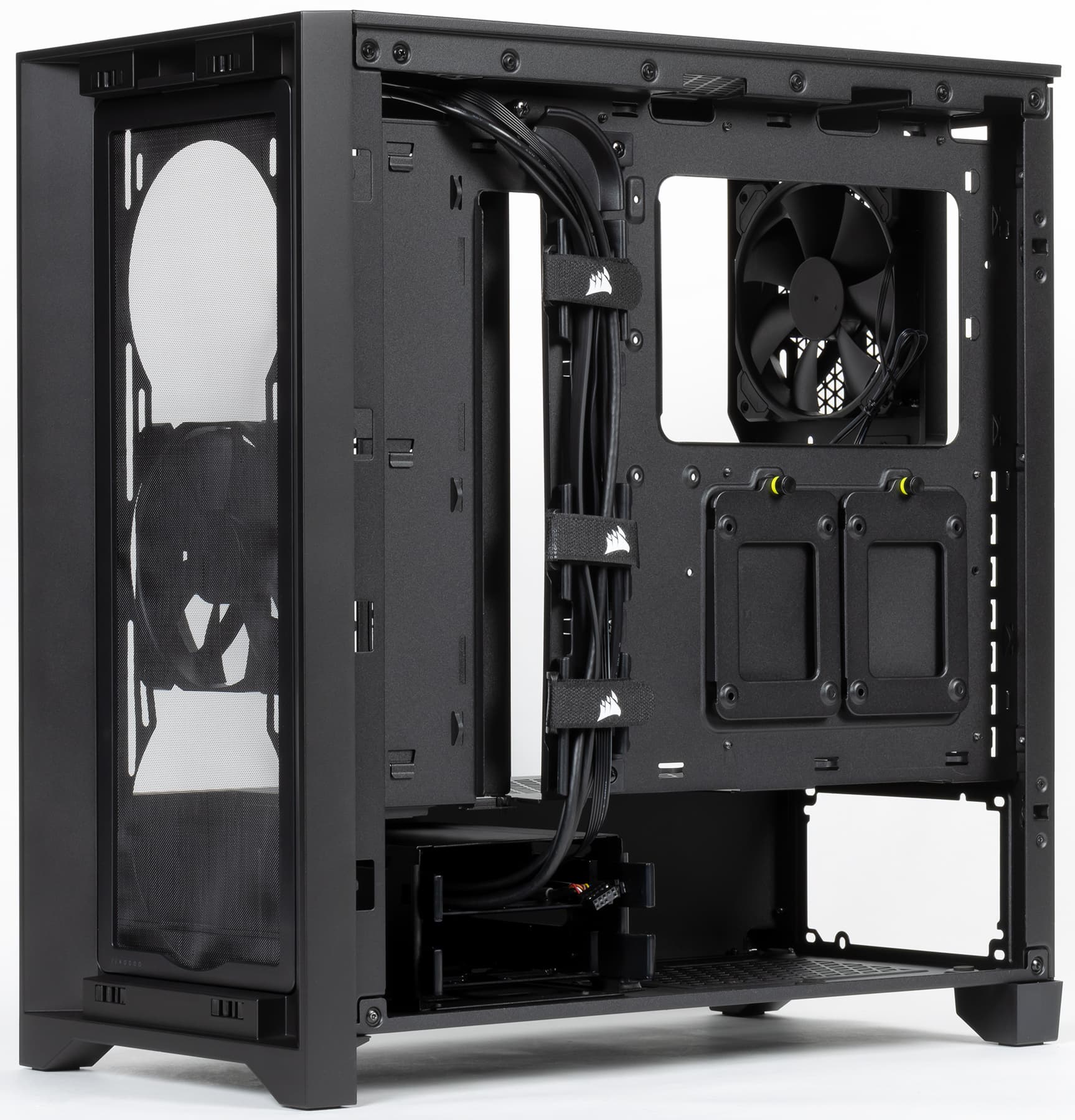 В корпусе предустановлены два вентилятора Corsair AirGuide типоразмера 120 мм со скоростью вращения около 1150 об/мин: один спереди и один сзади.