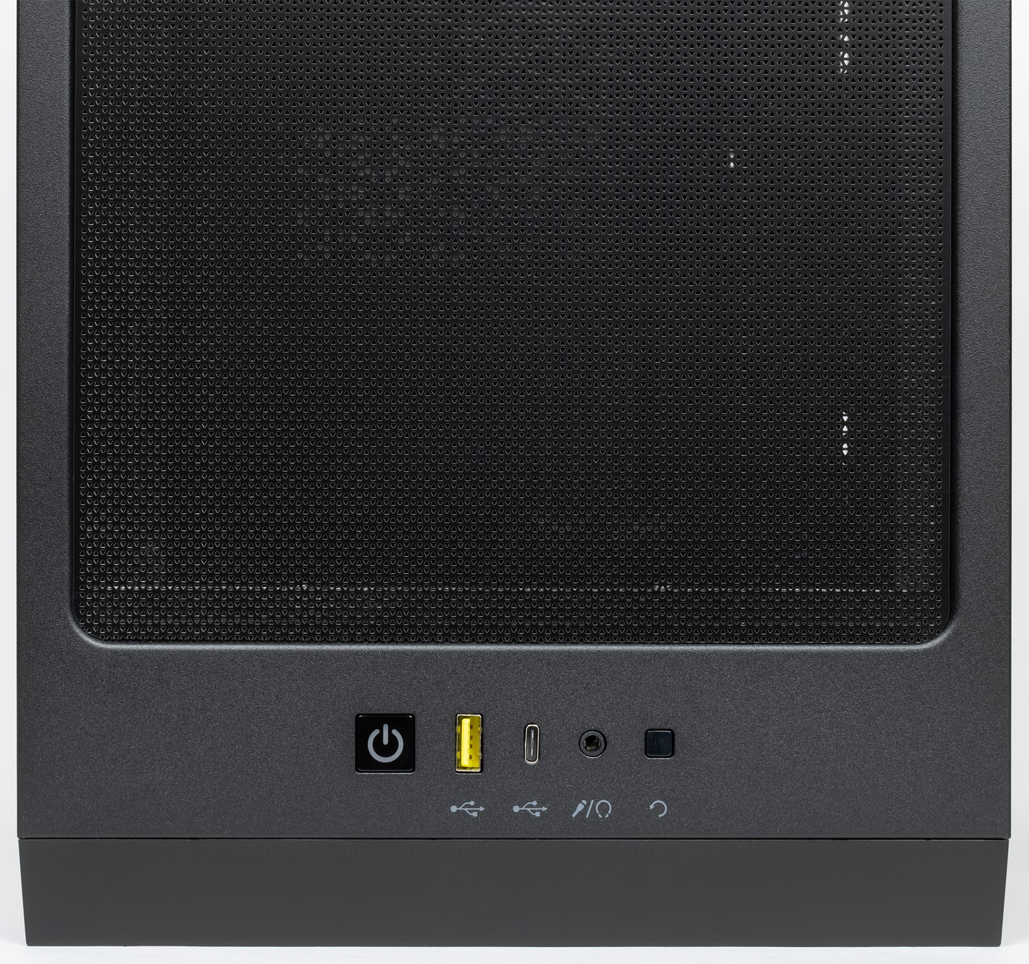 На верхней стенке в передней части корпуса размещены органы управления и коммутации. В их состав входят один порт USB3 Gen1 (USB 3.0) Type-A, один порт USB3 Gen2 (USB 3.1) Type-C и комбинированный разъем для подключения микрофона и наушников или гарнитуры. Таким образом, корпус позволяет подключать проводные гарнитуры как с цифровым, так и с аналоговым интерфейсом со стороны передней панели. На фоне бюджетных моделей, в которых до сих пор можно встретить пару USB 2.0, здесь все отлично. Но разъемов USB все-таки хотелось бы видеть чуть больше, один разъем Type-A — это, конечно, не очень здорово для корпуса с таким позиционированием и ценником.