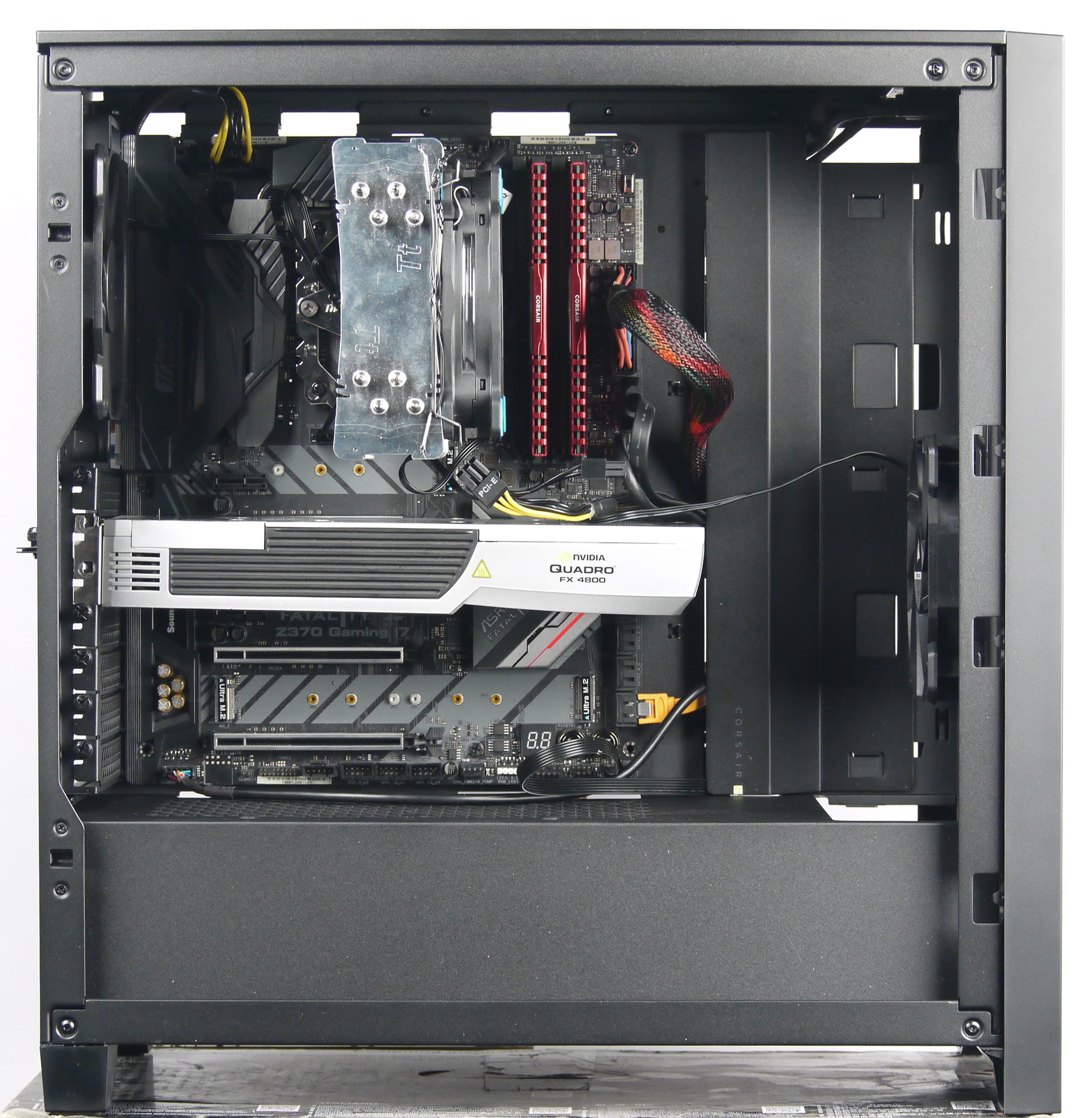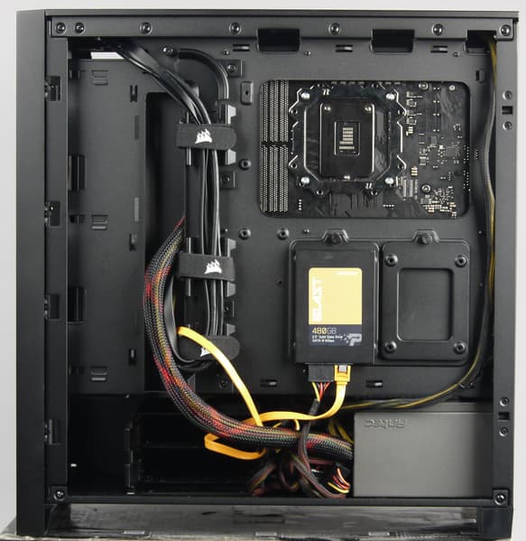 К одной из особенностей данной модели производитель относит «систему управления кабелями Corsair RapidRoute». С практической точки зрения, это вертикальное монтажное отверстие, прикрытое стальной стационарной накладкой (кожухом). Прокладывать провода через это отверстие действительно удобно, но есть нюанс. Дело в том, что высота данного кожуха над основанием для системной платы составляет около 28 мм, а высота системной платы в данном месте (высота радиатора с накладкой) — около 22 мм. Это несколько осложняет выбор видеокарты, если ее длина превышает 27 см (это расстояние от монтажных отверстий на задней панели до кожуха проводов), поскольку некоторые модели видеокарт будут упираться своей нижней частью в кожух.