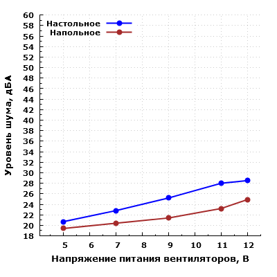 При большем удалении корпуса от пользователя и размещении его, к примеру, на полу под столом шум можно будет охарактеризовать как минимально заметный при питании вентиляторов от 5 В, а при питании от 12 В — как низкий для жилого помещения в дневное время суток.