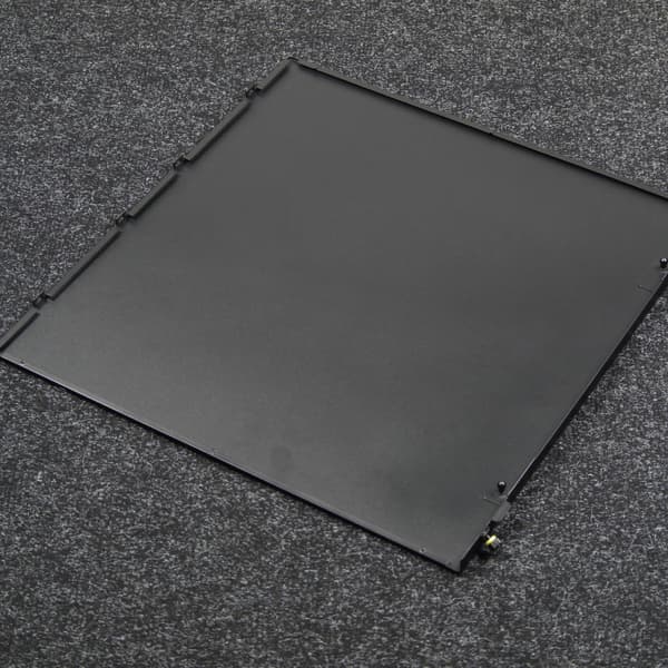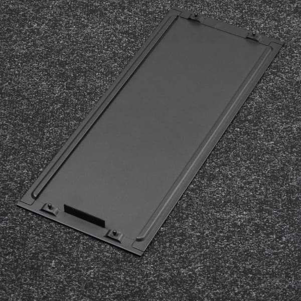 Передняя панель состоит из двух частей. Внутренняя рамка фиксируется на шасси корпуса при помощи тугих защелок, выполнена она из пластика черного цвета, который окрашен в массе. Лицевая часть панели представляет собой накладку из стали, которая фиксируется при помощи распорных элементов сферической формы. Фиксация получается весьма надежная, да и дизайн смотрится интересно. Сама накладка имеет большую жесткость за счет сплошной структуры без отверстий и вальцовки по краям. Так что «звук пустого ведра» при ее простукивании отсутствует.