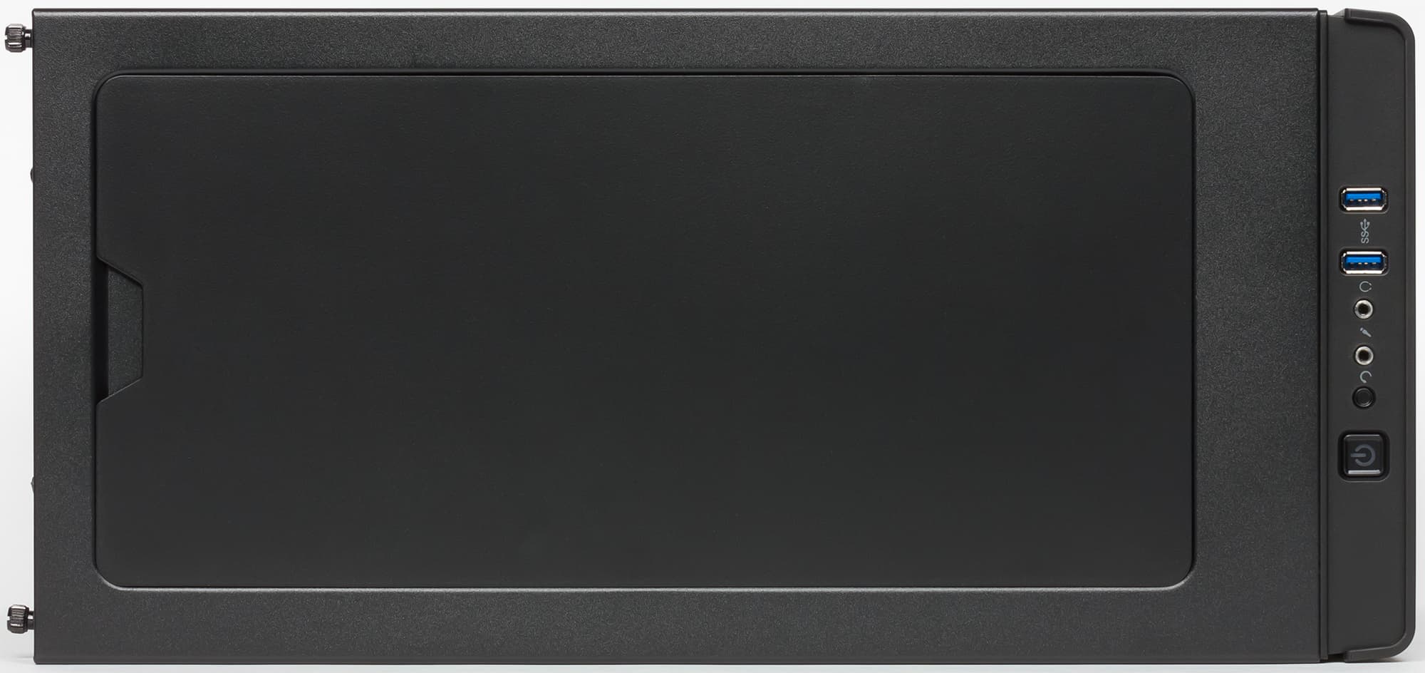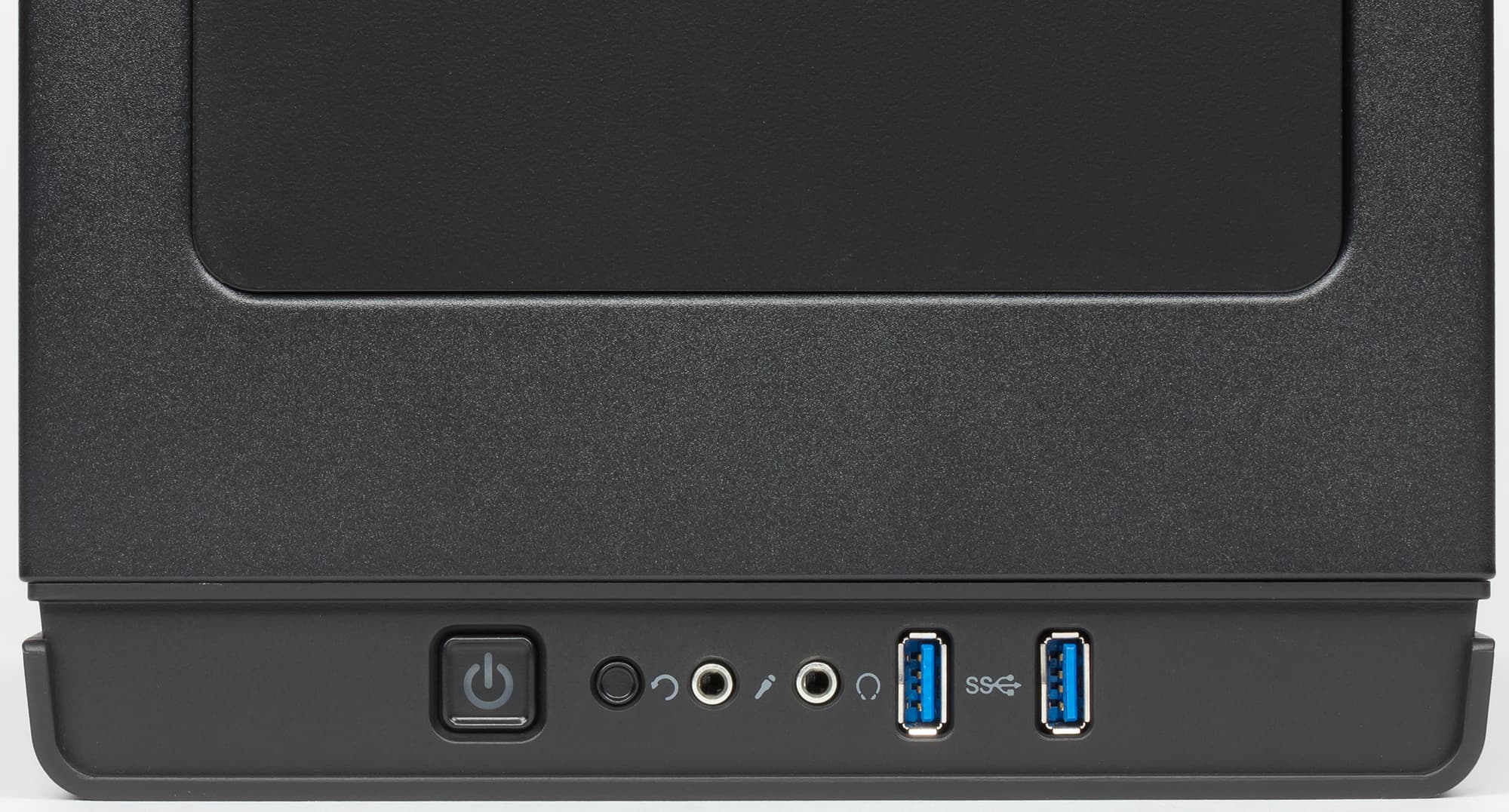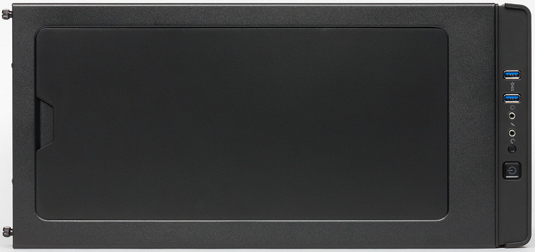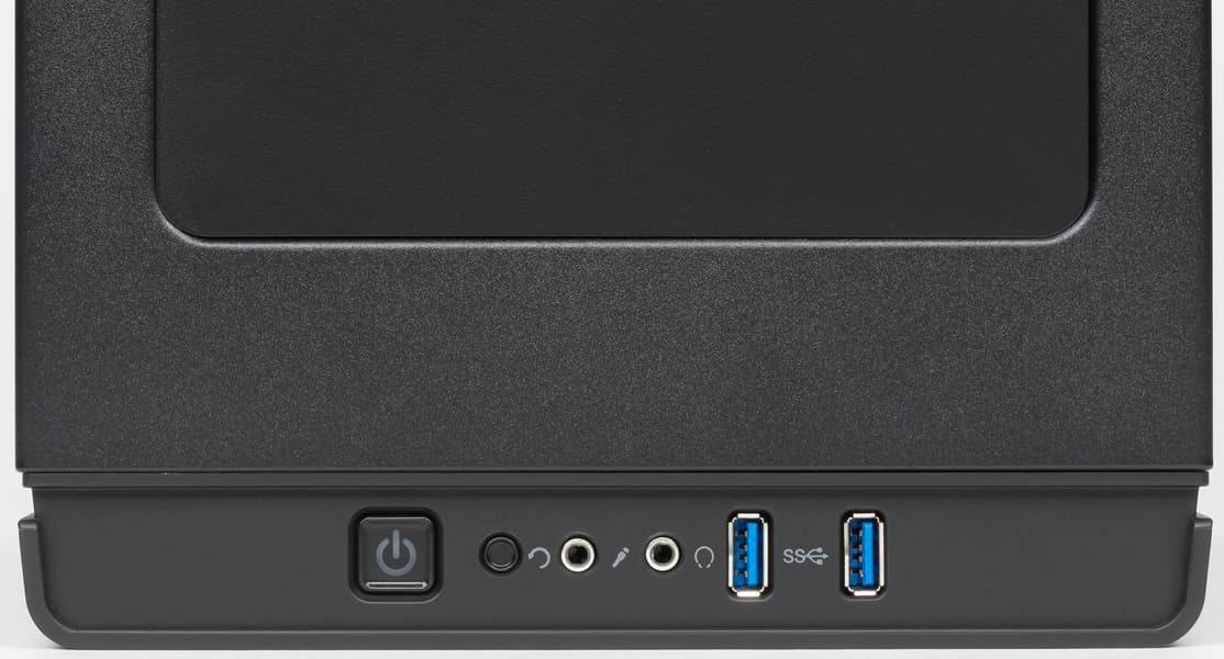 В передней части верхней панели размещены органы управления и коммутации. В их состав входят два разнесенных друг от друга примерно на 8 мм порта USB 3.0, стандартные разъемы для подключения микрофона и наушников, большая квадратная кнопка включения, круглая кнопка перезагрузки.