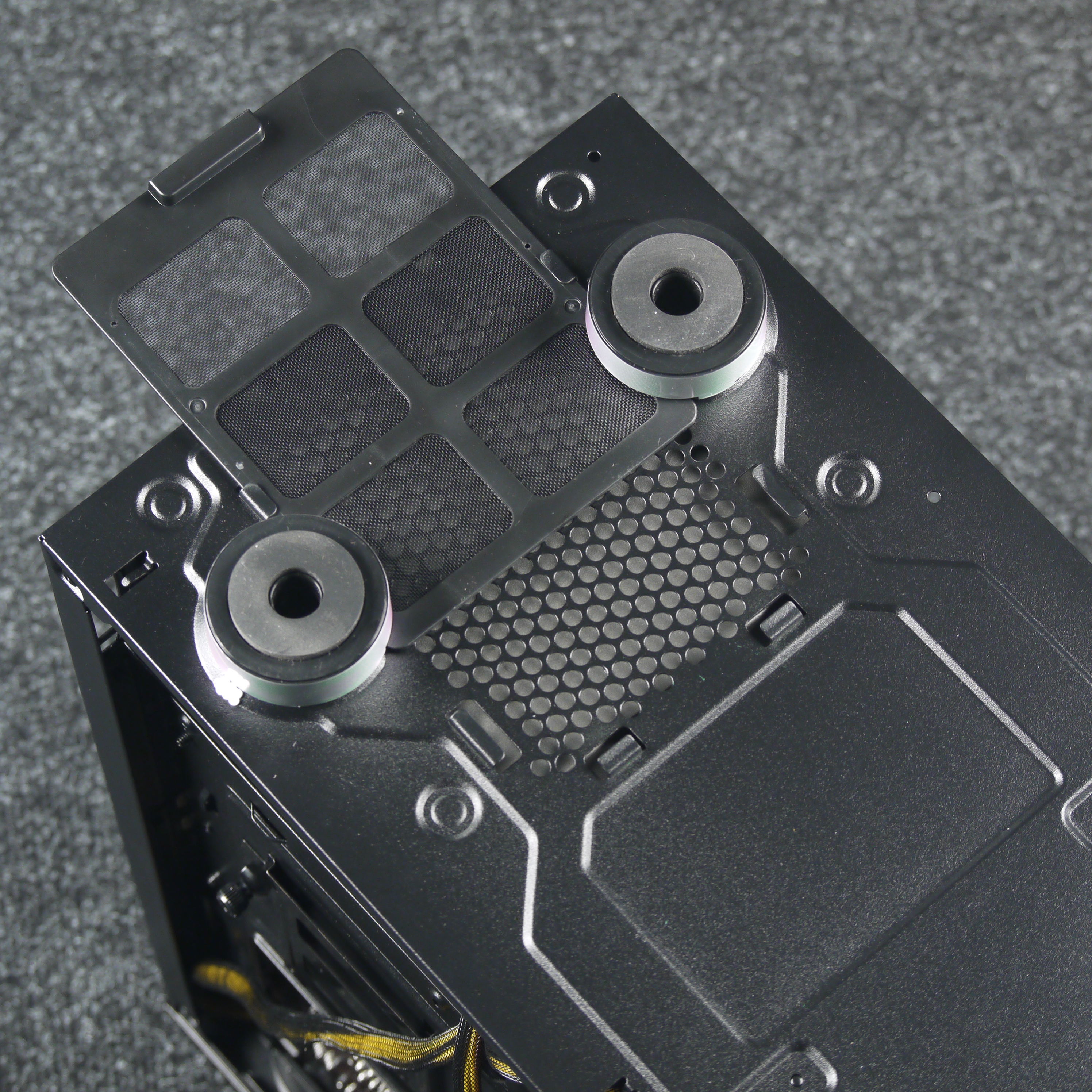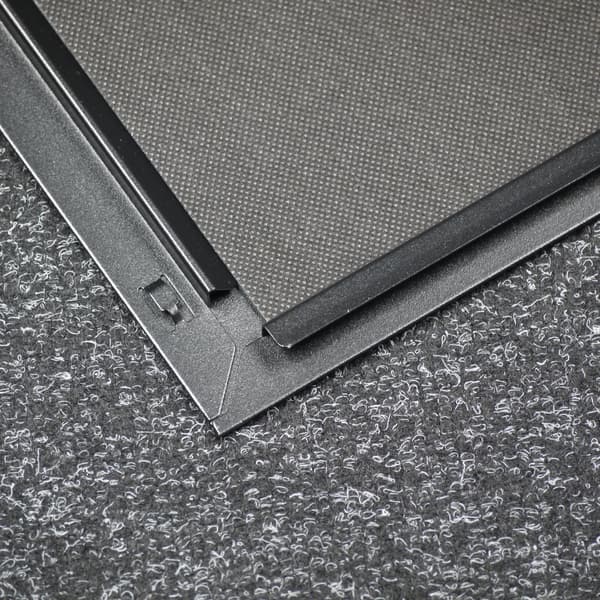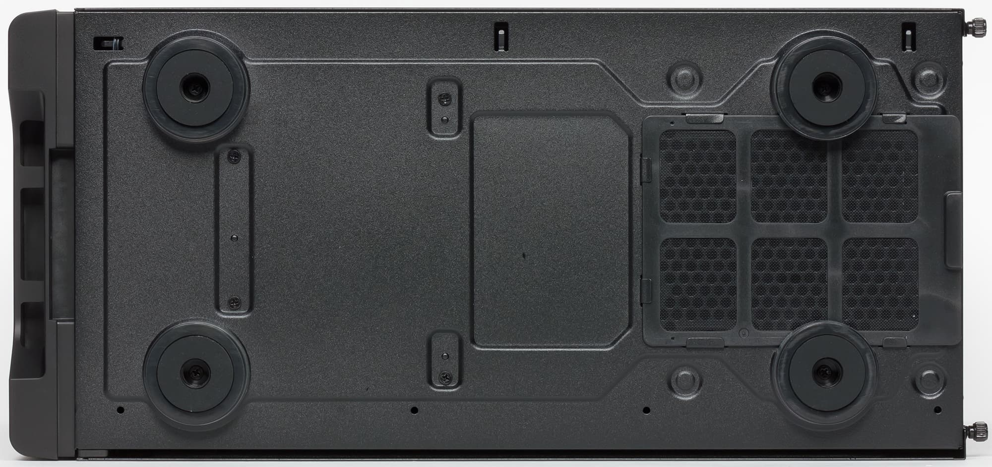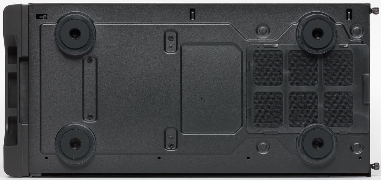 Фильтр на нижней стенке шасси выполнен из мелкой синтетической сетки, которая заключена в пластиковую рамку. Его можно считать быстросъемным, так как для его извлечения не требуется каких-либо дополнительных действий. Аналогичный по конструкции фильтр (но с магнитным креплением) установлен и спереди, однако для его очистки нужно снимать переднюю панель.