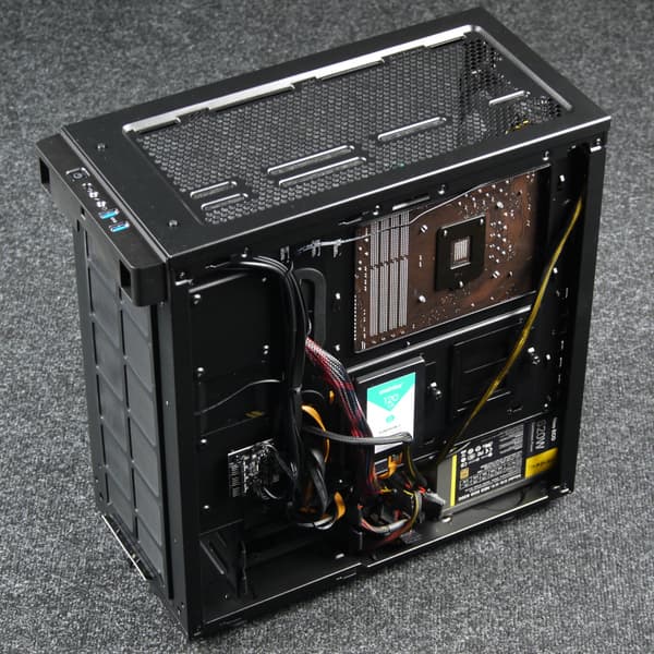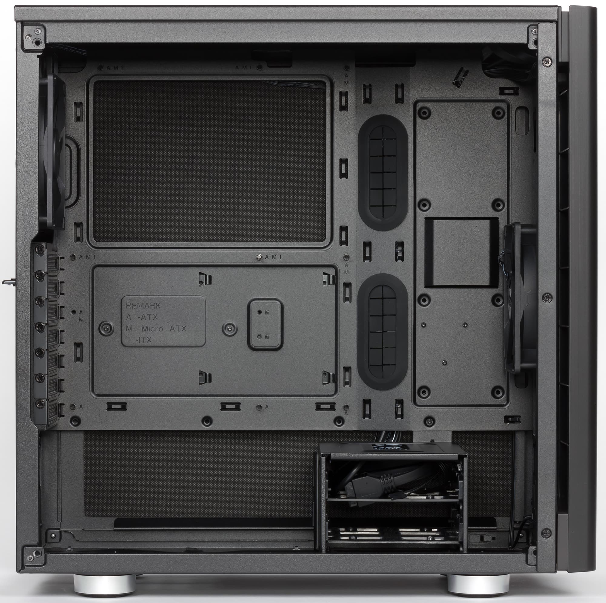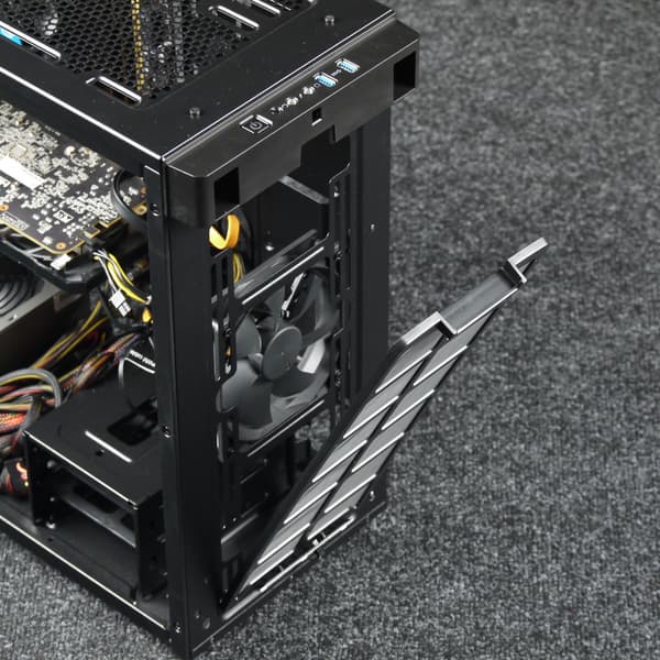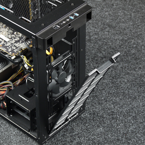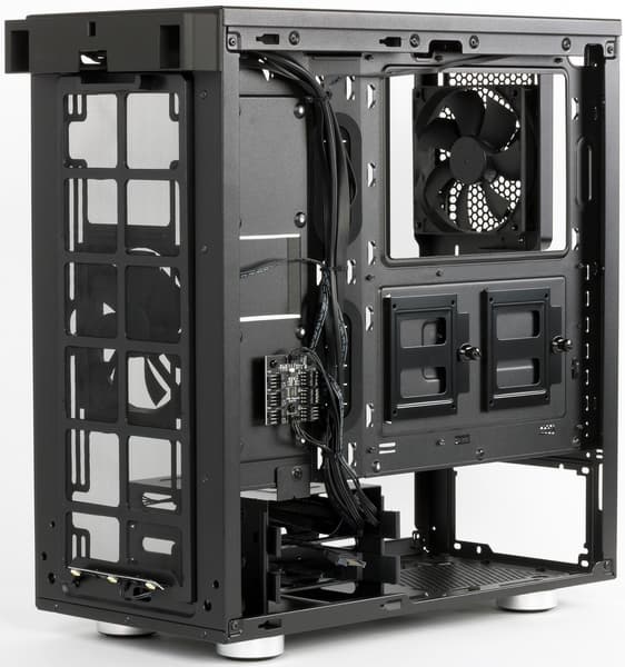 Компоновочные решения данной модели определяются современными тенденциями корпусостроения. В данном случае разработчики отказались от отсека для устройств формата 5,25″, а привычный отсек для устройств 3,5″ расположен около передней стенки шасси, но присутствует он в усеченном виде — всего на два диска. При желании его можно снять, открутив винты с двух сторон.