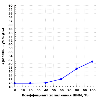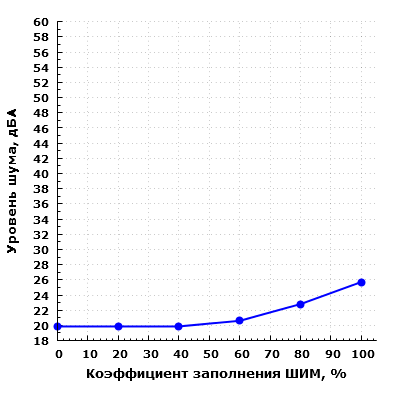 Мы провели измерения уровня шума системы охлаждения корпуса при изменении коэффициента заполнения ШИМ от 0 до 100% с шагом 20%.
