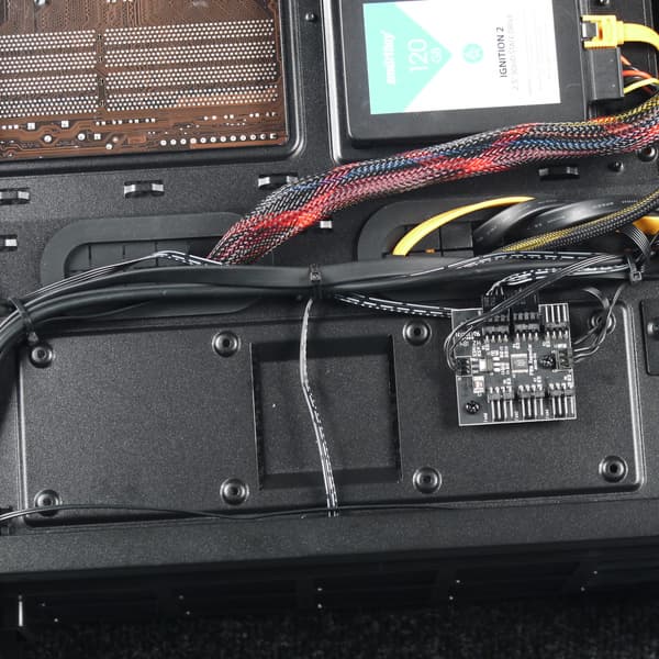 По умолчанию оба вентиляторы подключены к штатному контроллеру, который поддерживает до шести вентиляторов с ШИМ-управлением. Контроллер представляет собой полностью автоматическое решение с собственным питанием от разъема SATA Power и использует для управления вентиляторами сигнал ШИМ от разъема системной платы. Никаких внешних органов управления тут нет. Подобная реализация является наиболее удобной для обычного пользователя на сегодняшний день.