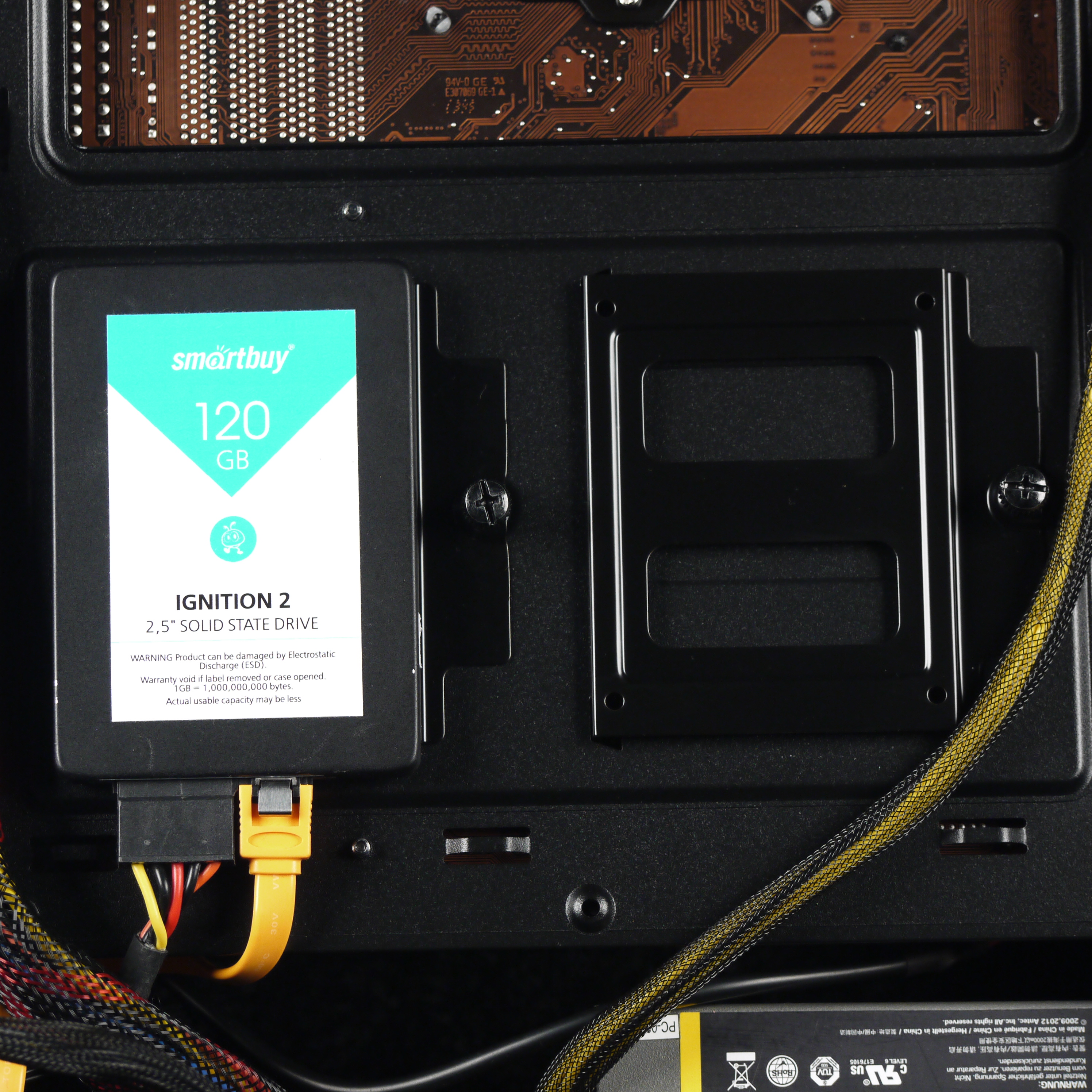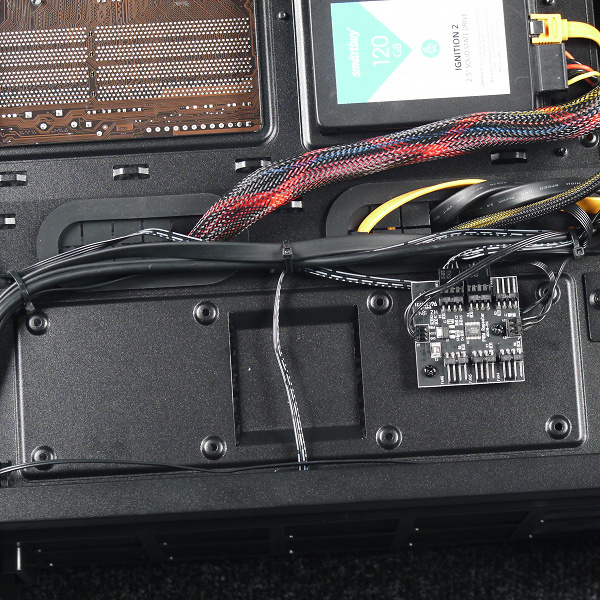 Для установки еще двух накопителей формата 2,5″ предусмотрены два посадочных места с той же стороны около передней стенки шасси. Здесь фиксация накопителя осуществляется при помощи винтов, которые нужно закрутить в накопитель со стороны его дна сквозь основание для системной платы, с лицевой стороны. Правда, на одно из этих посадочных мест установлен контроллер вентиляторов, но при большом желании его можно передислоцировать, открутив винт.