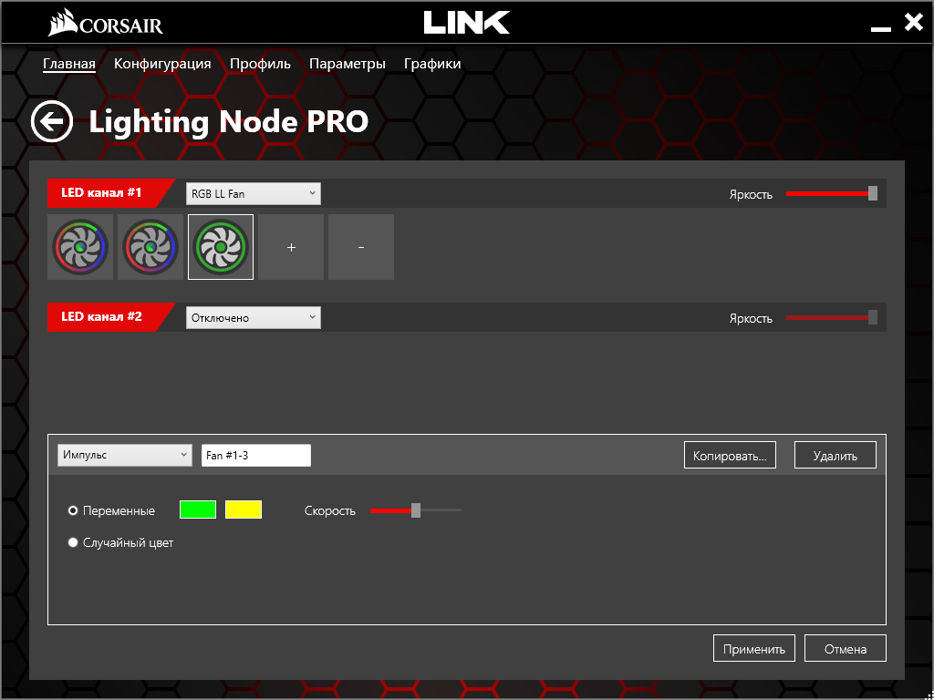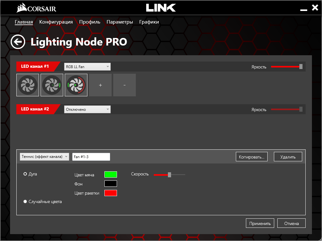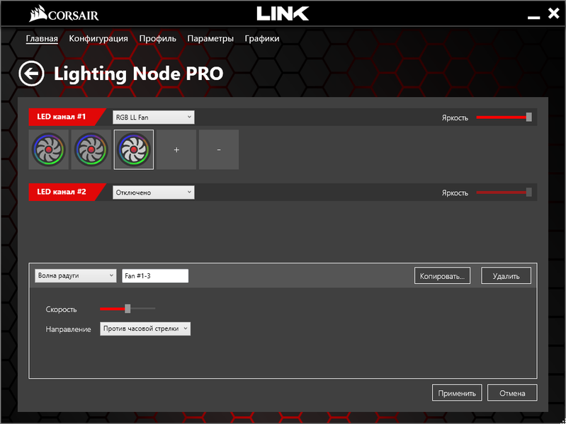 Мы выбрали «RGB LL Fan» в соответствии с реалиями корпуса и добавили кнопкой «+» еще два таких же устройства на одном канале, тогда заработала подсветка у всех трех. Яркость регулируется движком справа, его нулевое положение отключит светодиоды (для отработки любых изменений требуется нажать кнопку «Применить»).