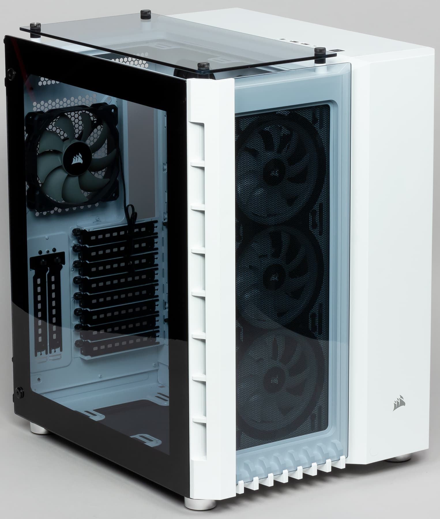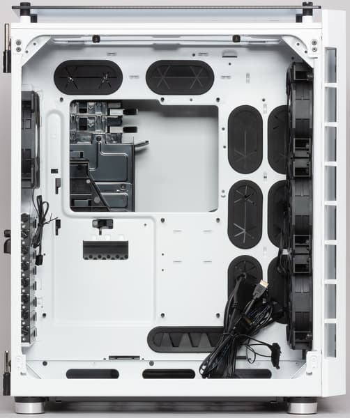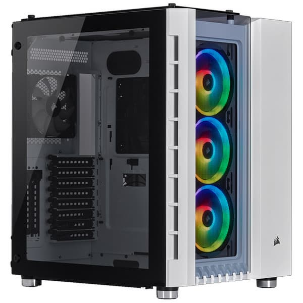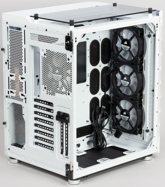 Корпус Corsair Crystal 680X RGB, как и 280Х, поставляется в двух вариантах расцветки — полностью черном и белом с некоторым количеством черных контрастных элементов во внутренней отделке. Степень тонировки стекол в обоих случаях гораздо меньше, чем в большинстве других корпусов со стеклянными элементами.