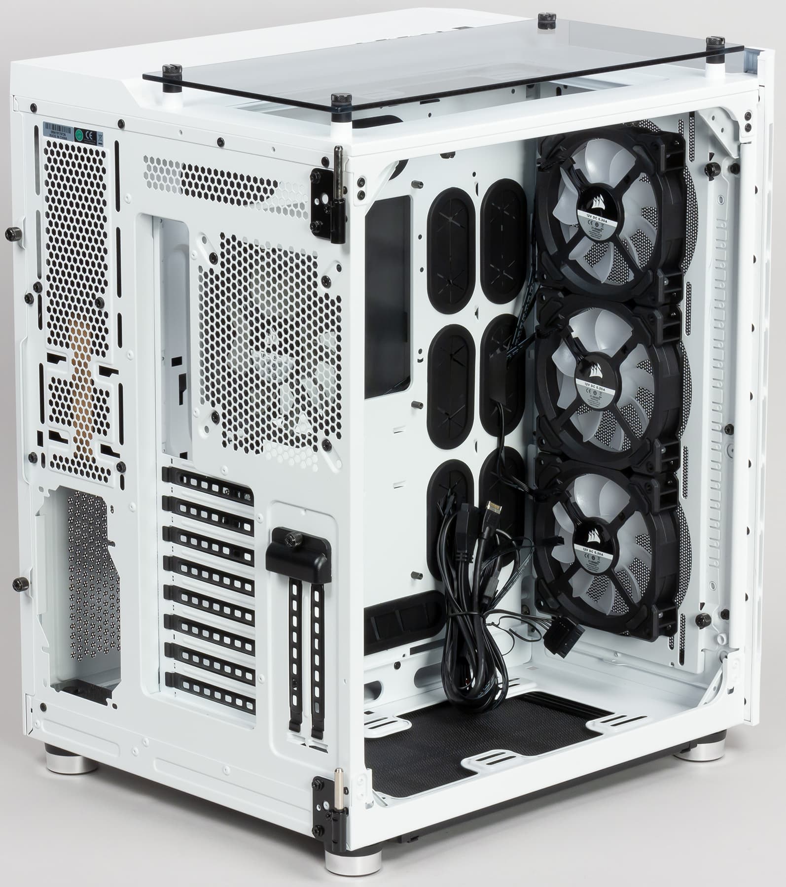 В штатное оснащение корпуса входят три 120-миллиметровых вентилятора Corsair LL120, оснащенных 16 независимыми RGB-светодиодами на двух отдельных световых контурах, что обеспечивает яркую подсветку с визуальными эффектами.