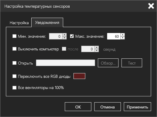 Кроме того, можно задать пороговые значения и назначить определенные действия по достижению одного из них — например, выключить компьютер или зажечь все светодиоды определенным цветом, чтобы привлечь внимание. Эти действия можно сочетать друг с другом.