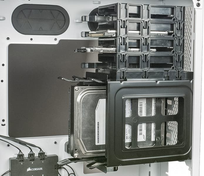 Для размещения дисков предусмотрена сдвоенная конструкция, размещенная в правой части. Основной элемент — привычная трехместная стойка, в которую накопители обеих размерностей вставляются на салазках. Только место для этой стойки выбрано необычное: сзади, по высоте примерно в середине задней стенки, причем салазки ориентированы не горизонтально, а вертикально.