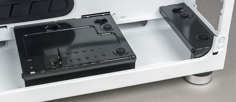 Наличие в корпусе двух объемов позволяет разделить потоки воздуха от системной платы, включая установленные на ней компоненты, и блока питания, а расположение накопителей не препятствует движению воздуха.