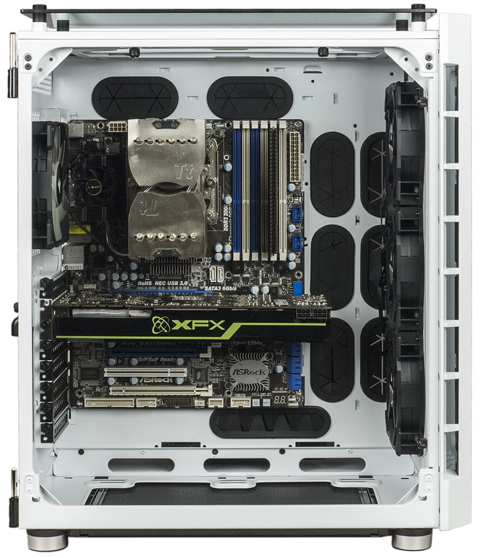 Конструкция предусматривает установку системной платы форматов до E-ATX включительно, восьми плат расширения длиной до 330 мм каждая (есть еще два дополнительных вертикальных слота) и до семи дисковых накопителей.