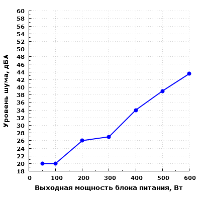 При нагрузке в 600 Вт шум блока питания уже превышает значение в 40 дБА при условии настольного размещения, то есть при расположении блока питания в ближнем поле по отношению к пользователю. Подобный уровень шума можно охарактеризовать как достаточно высокий.
