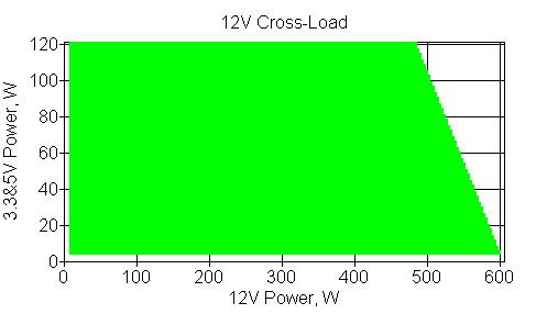 Следующим этапом инструментального тестирования является построение кросснагрузочной характеристики (КНХ) и представление ее на четвертьплоскости, ограниченной максимальной мощностью по шине 3,3&5 В с одной стороны (по оси ординат) и максимальной мощностью по шине 12 В с другой (по оси абсцисс). В каждой точке измеренное значение напряжения обозначается цветовым маркером в зависимости от отклонения от номинального значения.