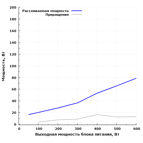 Экономичность модели находится на очень хорошем уровне: на максимальной мощности БП рассеивает около 78,7 Вт, 60 Вт он рассеивает на мощности порядка 450 Вт. На мощности 50 Вт блок питания рассеивает около 16,5 Вт.