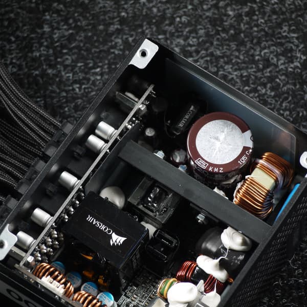 Компоновка элементов внутри блока питания демонстрирует грамотный подход разработчиков к вопросу охлаждения. Основные нагревающиеся элементы расположены вдоль потока воздуха, выходящего из БП, а не поперек его, как это реализовано в некоторых моделях формата SFX. Проводов внутри блока питания также минимум — все собрано на перемычках или контактах без использования гибких соединений, что позволяет освободить место для более эффективного воздухообмена внутри корпуса БП, а также снизить аэродинамическое сопротивление воздушному потоку, создаваемому вентилятором.