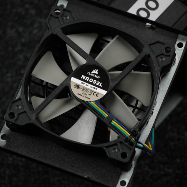 В блоке питания установлен вентилятор Corsair NR092L типоразмера 92 мм, имеющий скорость вращения 3950 оборотов в минуту при номинальном питании напряжением 12 В. Вентилятор основан на усовершенствованном подшипнике скольжения (Rifle Bearing). Выбор вентилятора с таким типом подшипника вызывает некоторые вопросы, связанные с долговечностью его работы в случае высоких нагрузок. Обычно в блоках питания данного формата устанавливаются вентиляторы на подшипниках качения или гидродинамических подшипниках, поэтому вентилятор на подшипнике скольжения с винтовой нарезкой представляется не лучшим выбором, особенно с учетом достаточно высокой скорости вращения вентилятора.
