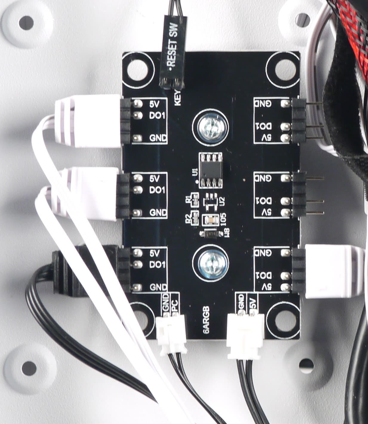 В качестве источников света используются светодиодная лента в передней панели и три вентилятора (два спереди и один сзади) с индивидуальной адресацией светодиодов, которые подключаются ко встроенному контроллеру при помощи стандартных трехконтактных разъемов типа ARGB с колодкой 1×4.