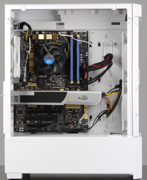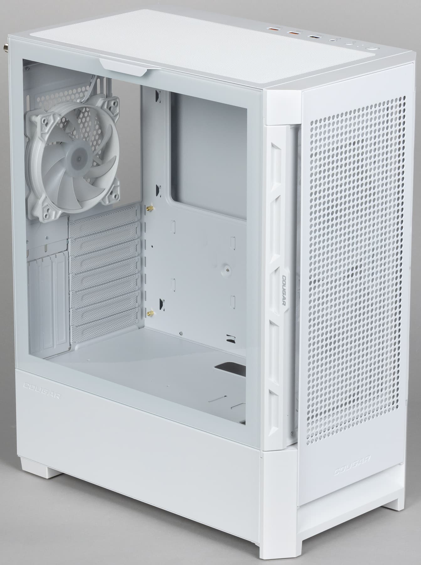 Левая стенка корпуса имеет оригинальную конструкцию, она состоит из двух частей: нижняя — стационарная стальная, а в верхней части установлена съемная панель, выполненная из закаленного стекла со стальными накладками.
