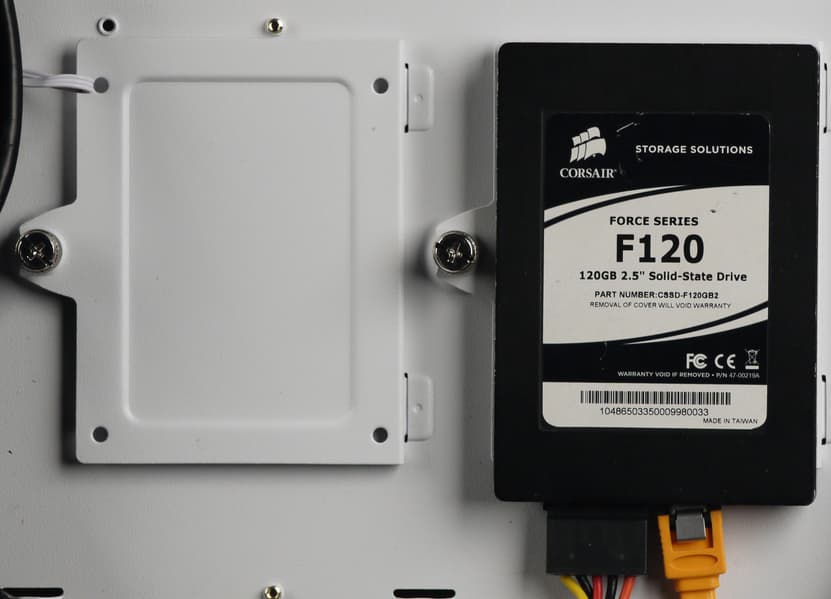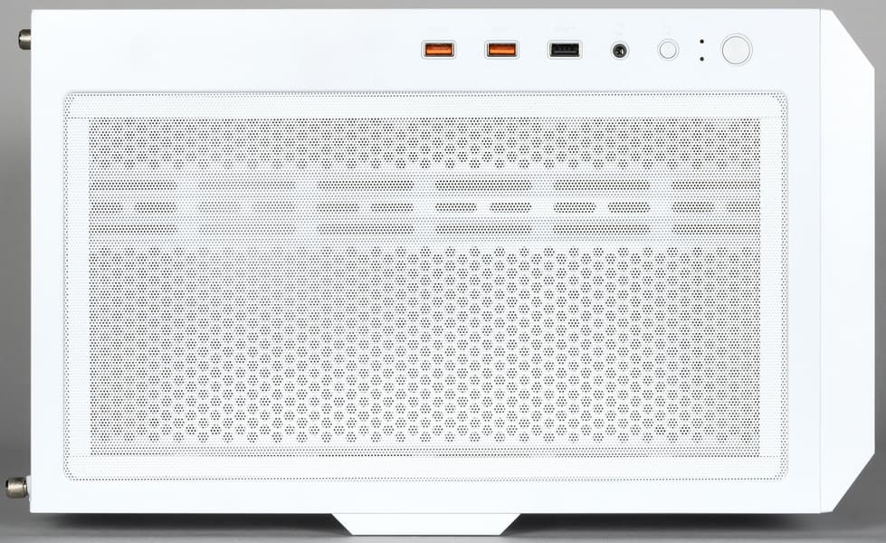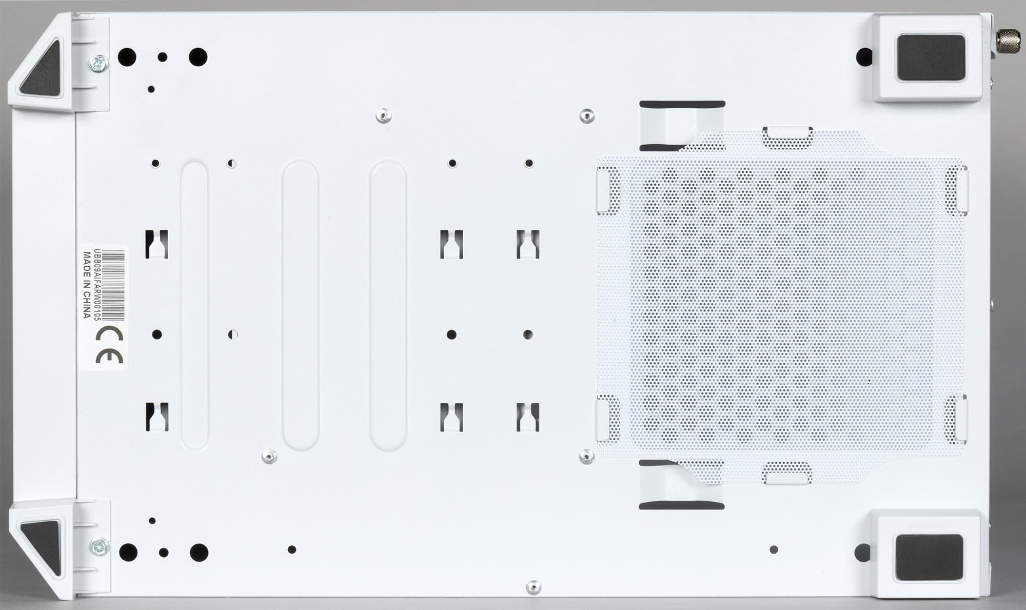 Компоновочные решения данной модели определяются современными тенденциями корпусостроения. В данном случае разработчики отказались от отсека для устройств формата 5,25″, а привычный отсек для устройств 3,5″ расположен около передней стенки шасси, но присутствует он в усеченном виде — всего на два диска. При желании его можно снять, открутив винт. Передвинуть отсек нельзя. Посадочные места для накопителей с внешним доступом в корпусе полностью отсутствуют.
