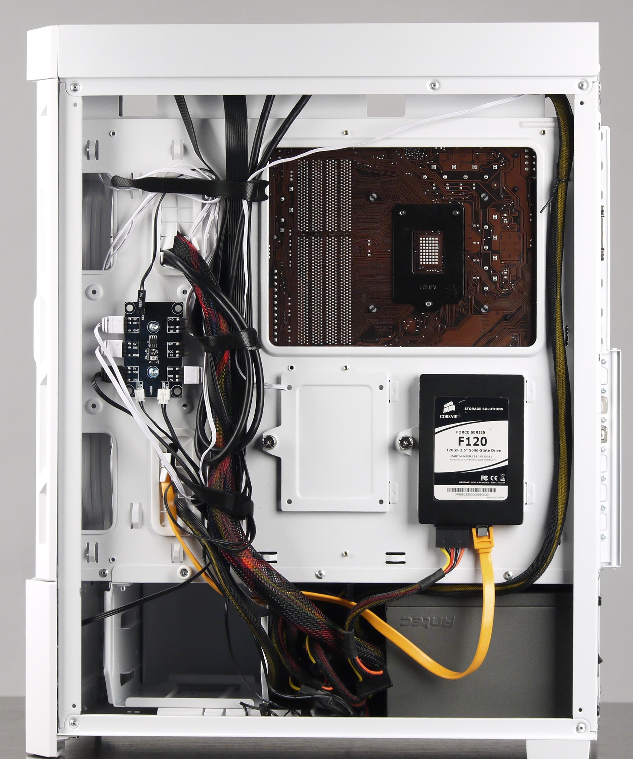 Глубина отсека для прокладки проводов составляет около 20 мм у задней стенки. Это не так уж много, поэтому блок питания лучше предпочесть с ленточными проводами. Для монтажа проводов предусмотрены петли для крепления стяжек или других аналогичных изделий, а также несколько нейлоновых стяжек с застежками типа Velcro. В монтажных отверстиях на основании для системной платы имеются лепестковые мембраны из резиноподобного материала, также монтажные отверстия для прокладки проводов есть и в кожухе блока питания, но мембран там уже нет.