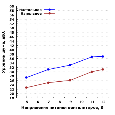 При питании вентиляторов напряжением 5 В шум находится на пониженном уровне даже при расположении микрофона в ближнем поле. Однако с ростом напряжения питания уровень шума возрастает, и в типовом диапазоне регулирования напряжения 7—11 В шум изменяется от пониженного (31 дБА) до среднего (36,8 дБА) уровня относительно типичных значений для жилых помещений в дневное время суток. При большем удалении корпуса от пользователя и размещении его, к примеру, на полу под столом, шум можно будет охарактеризовать как минимально заметный при питании вентиляторов от 5 В, а при питании от 12 В — как пониженный для жилого помещения в дневное время суток.