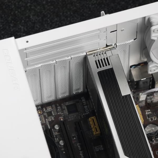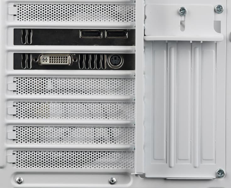 Система фиксации карт расширения вроде бы довольно простая: она осуществляется винтами снаружи корпуса под общей прижимной планкой, как у дешевых корпусов. Но тут разработчики решили удивить всех и скрестили ужа с ежом, объединив в одном блоке на задней панели два варианта установки карт расширения: поперечное и продольное относительно системной платы — в первом случае карты в стоящем вертикально корпусе располагаются горизонтально, а во втором — вертикально.