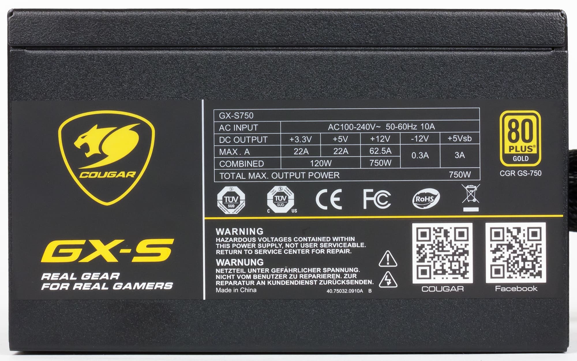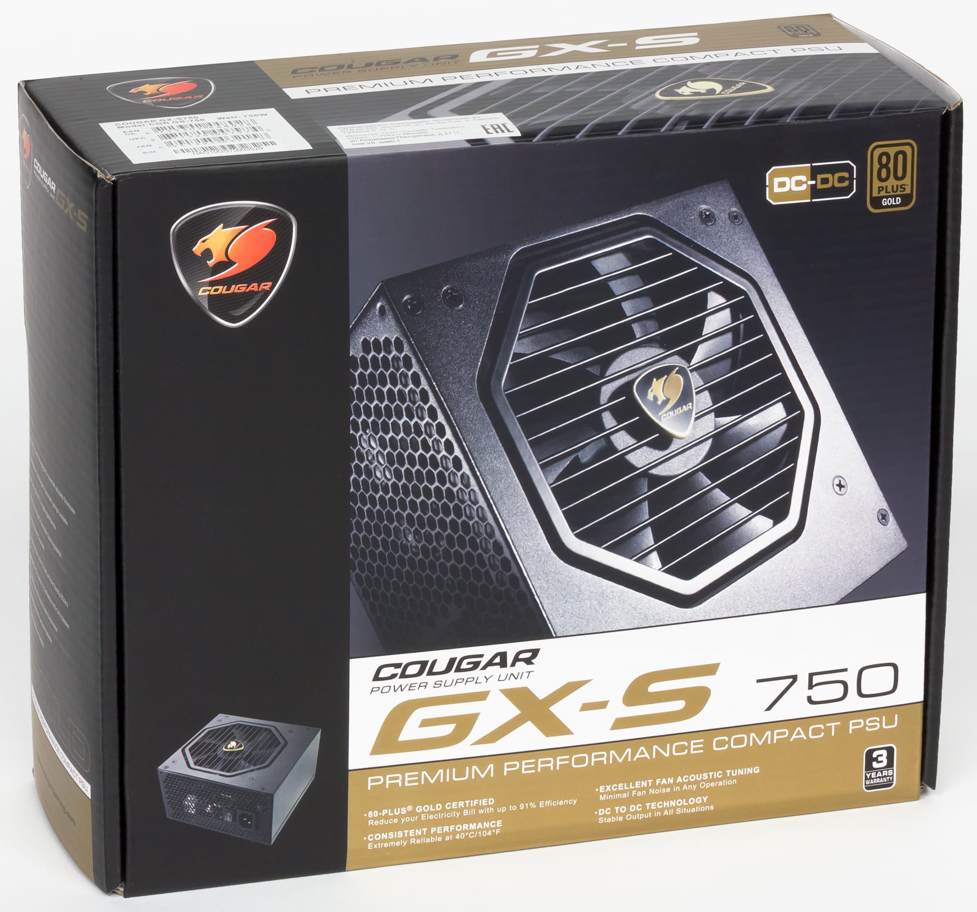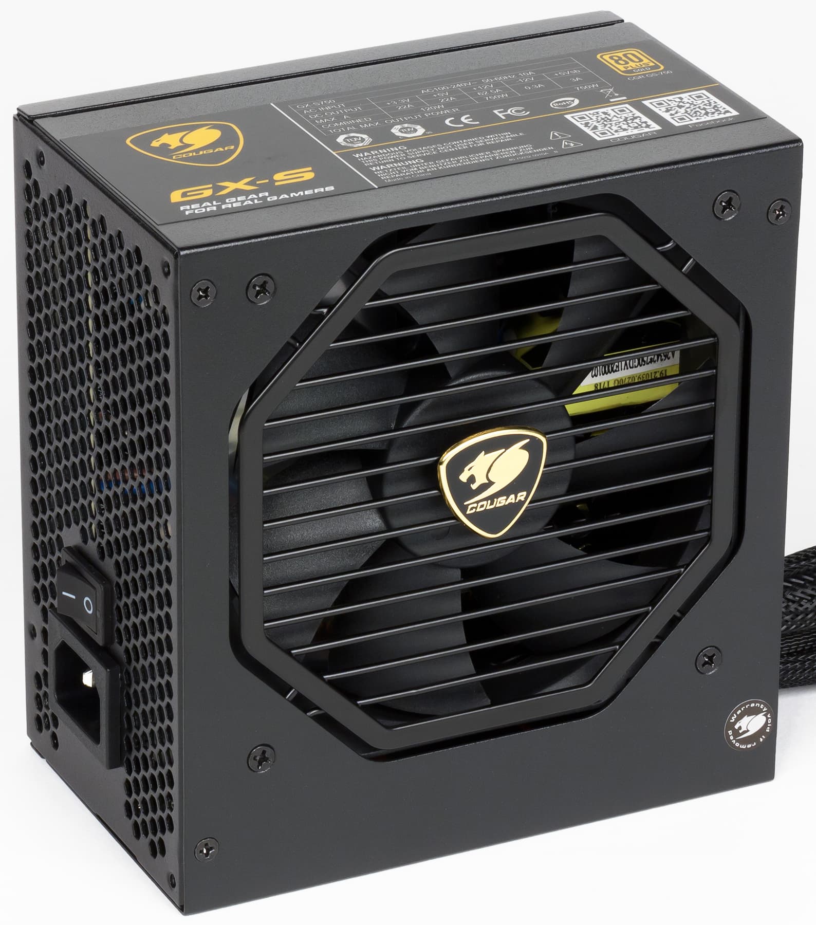 В ассортименте блоков питания, выпускаемых под торговой маркой Cougar, представлены девять серий, которые разделены на три группы: 80Plus Gold, 80Plus Bronze и 80Plus. К группе 80Plus Gold относятся серии GX-F, GX и GX-S, а серия GX-S, в свою очередь, содержит четыре модели мощностью 450, 550, 650 и 750 Вт. Для тестирования нам была предоставлена старшая модель мощностью 750 Вт — GX-S750 (CGR-GS750).